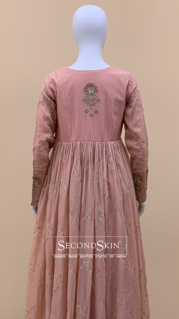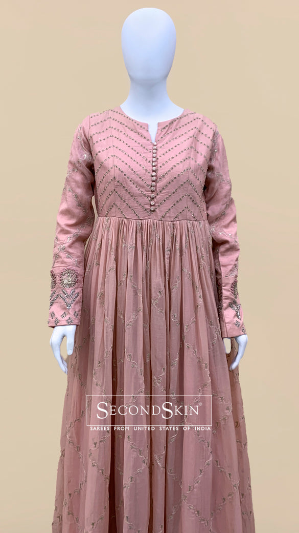 Anarkali dress features a kora fabric with an all over floral embroidery work pattern. The bottom is made of self plain silk fabric, and a matching dupatta is included.