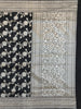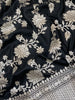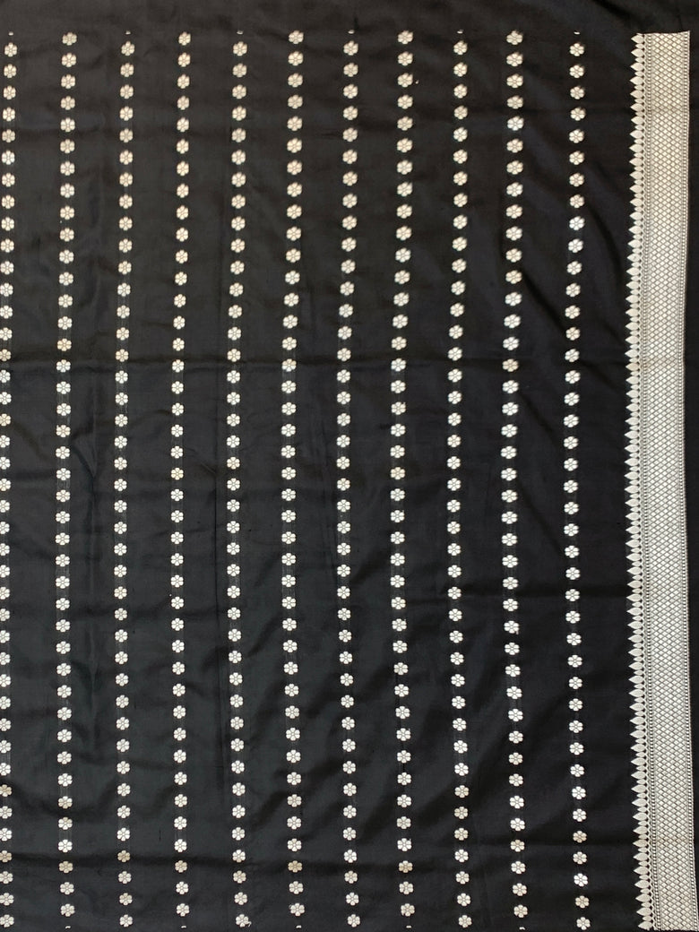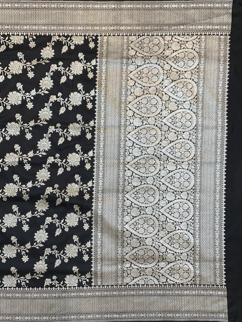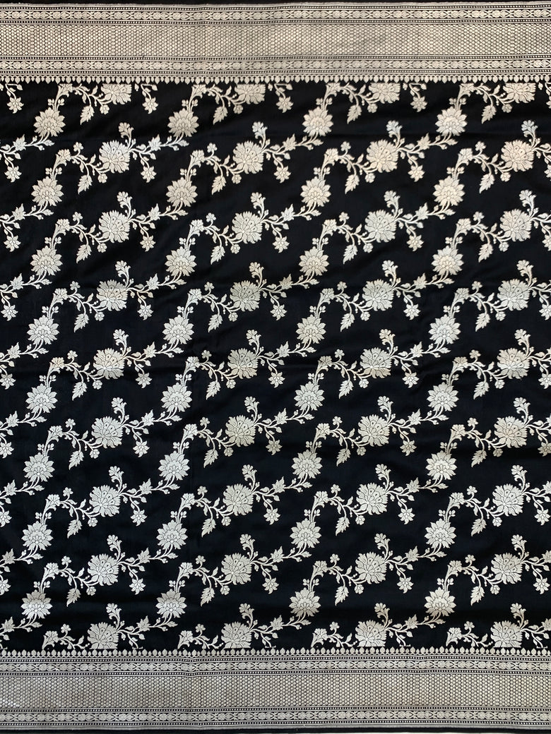 This black banarasi kadwa weave silk saree features a striking all-over silver zari floral jaal design, complemented by a self brocade border and floral pallu. The blouse also showcases self floral buttis with a zari border.
