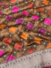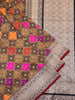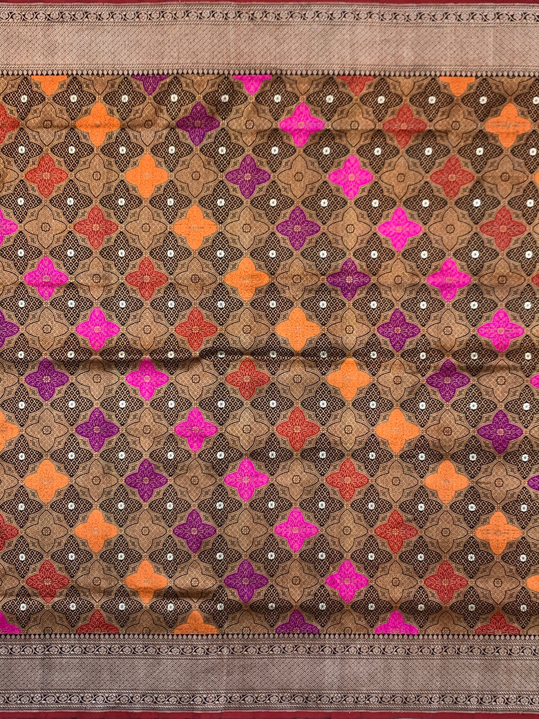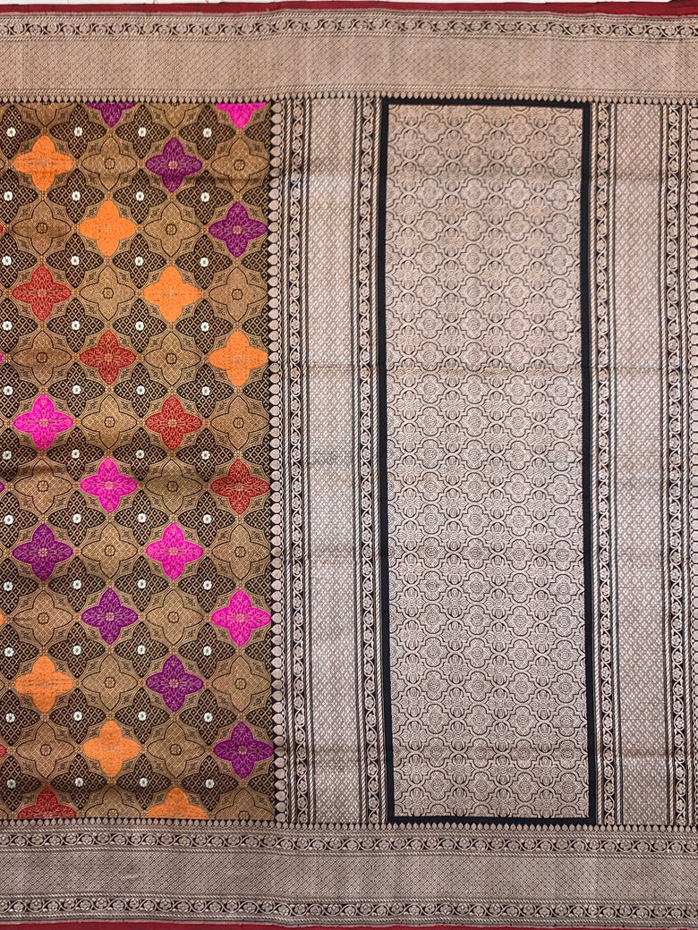 The banarasi kadwa weave silk saree features an intricate pattern of copper zari and meenakari, with floral and geometrical designs throughout the fabric. It also includes a border and pallu with self brocade details, all in a classic black color with a zari border.