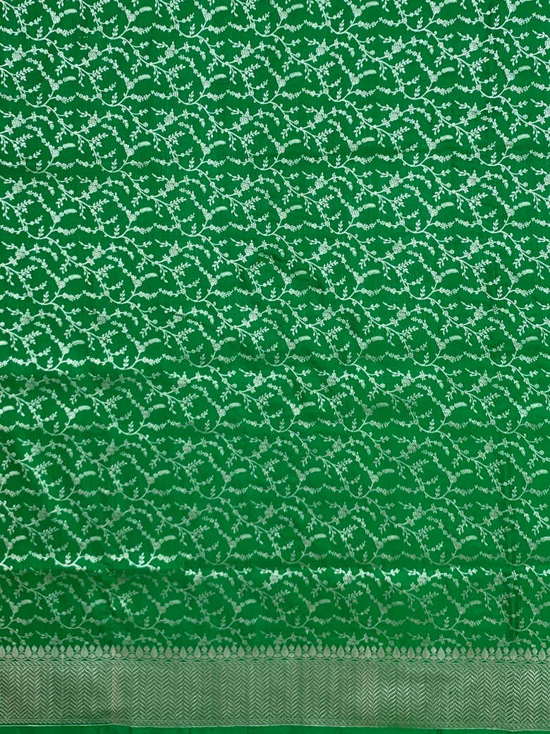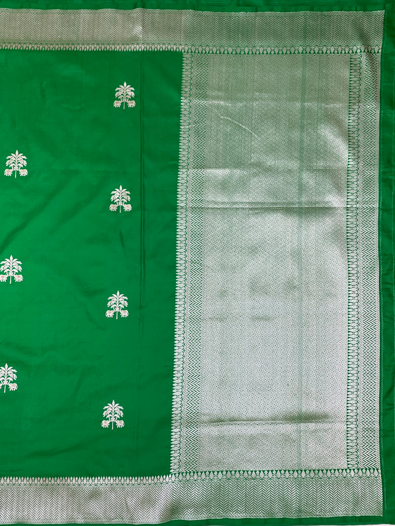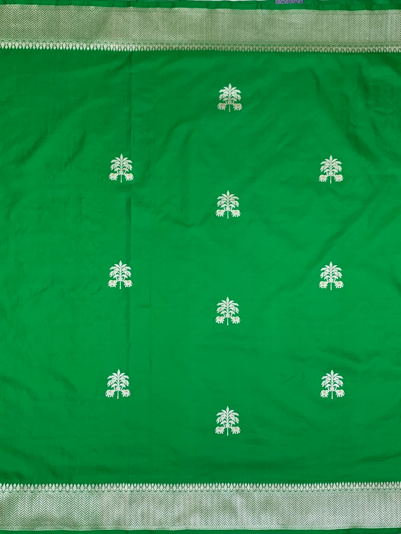 This green banarasi kadwa weave silk saree features an intricate all-over design of silver and gold zari floral and elephant motif buttis. It is enhanced with a self-brocade border and pallu, complemented by a blouse showcasing a matching floral jaal pattern with zari border.