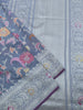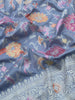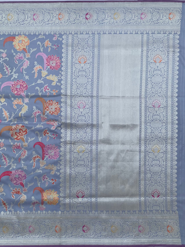 This Banarasi Kadwa Weave Silk Saree in Ice-Blue boasts a stunning all-over pattern of silver zari and meenakari floral jaal, accompanied by a self floral border and brocade pallu. The accompanying blouse features self silver zari stripes and a zari border for a coordinated look.
