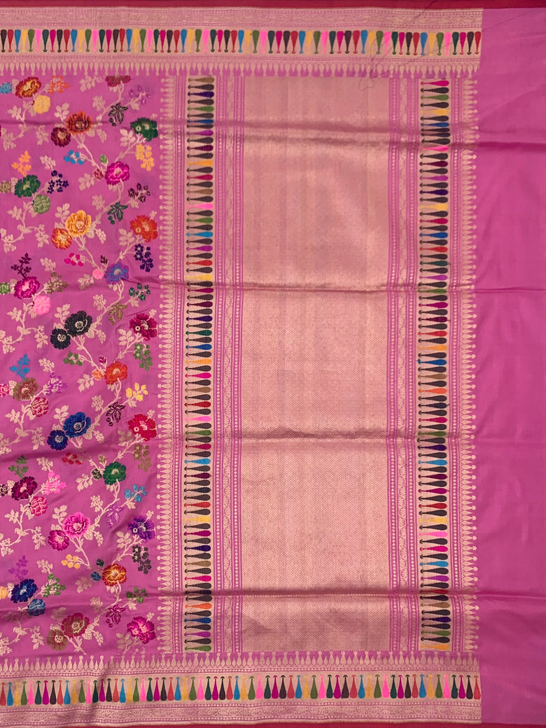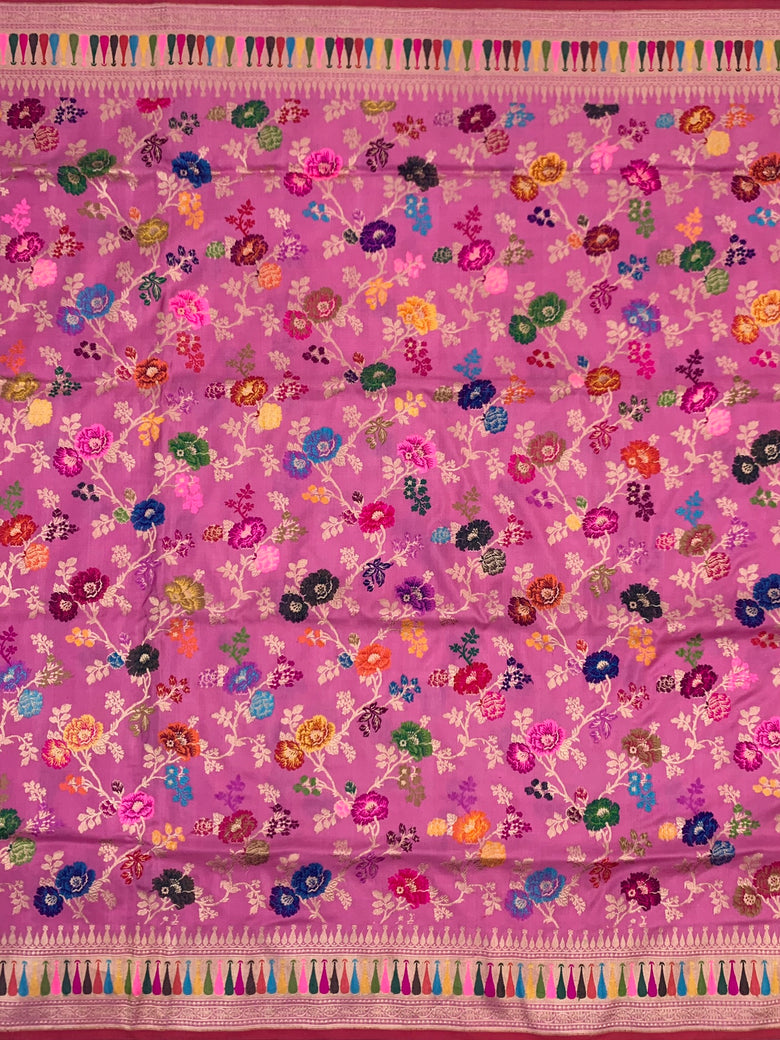 This Banarasi kadwa weave silk saree in light-magenta showcases a classic motif border and brocade pallu. It is embellished with an intricate all-over design of gold zari and meenakari floral jaal. The blouse adds an elegant touch with its gold zari stripes and border.