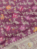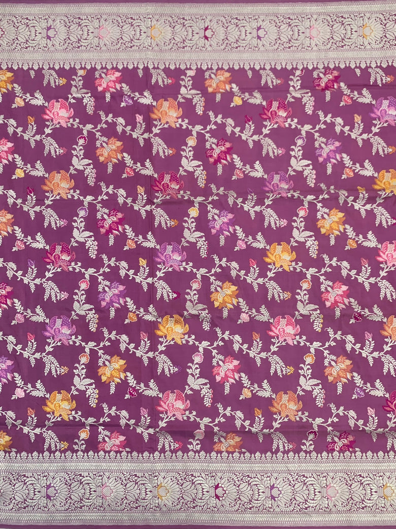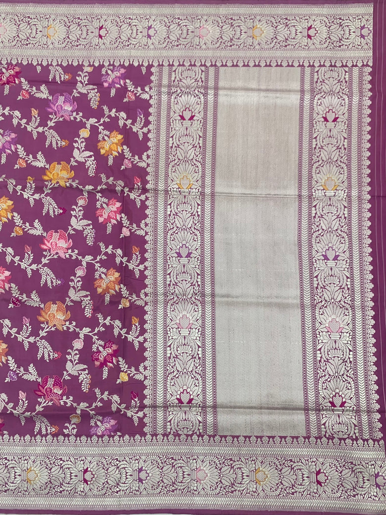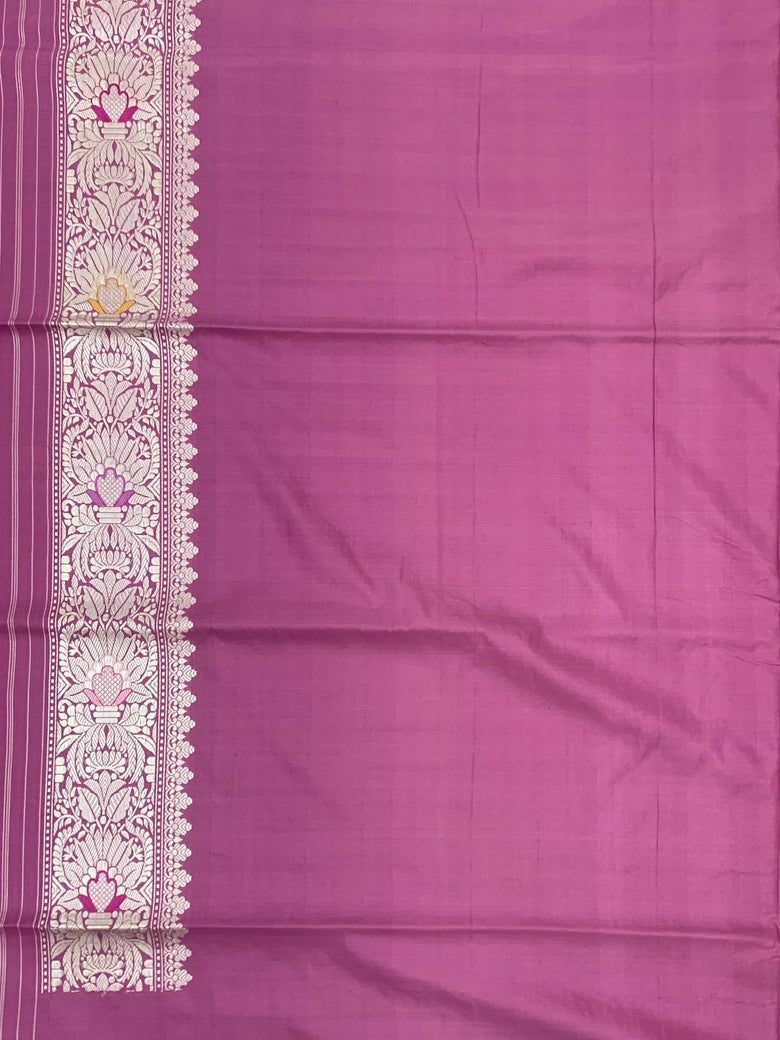 This Banarasi Kadwa Weave Silk Saree in light-magenta showcases stunning silver zari and meenakari floral jaal throughout the saree, along with a self floral border and brocade pallu. The accompanying blouse is self plain with a zari border, completing the elegant and traditional look.
