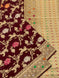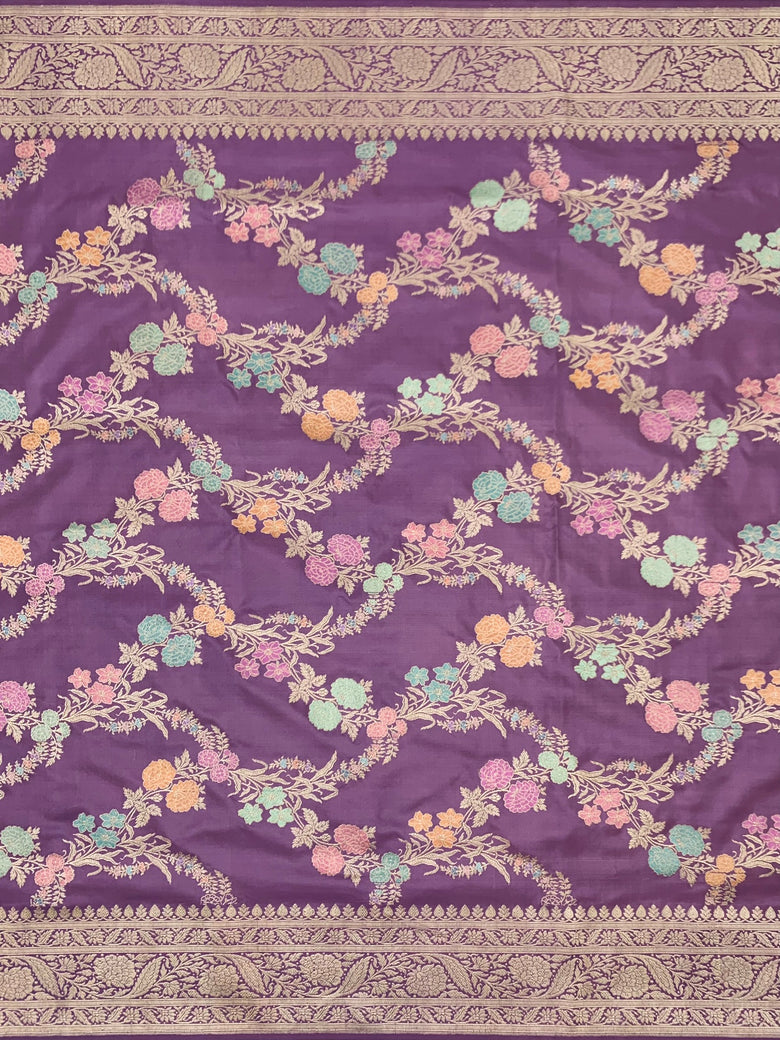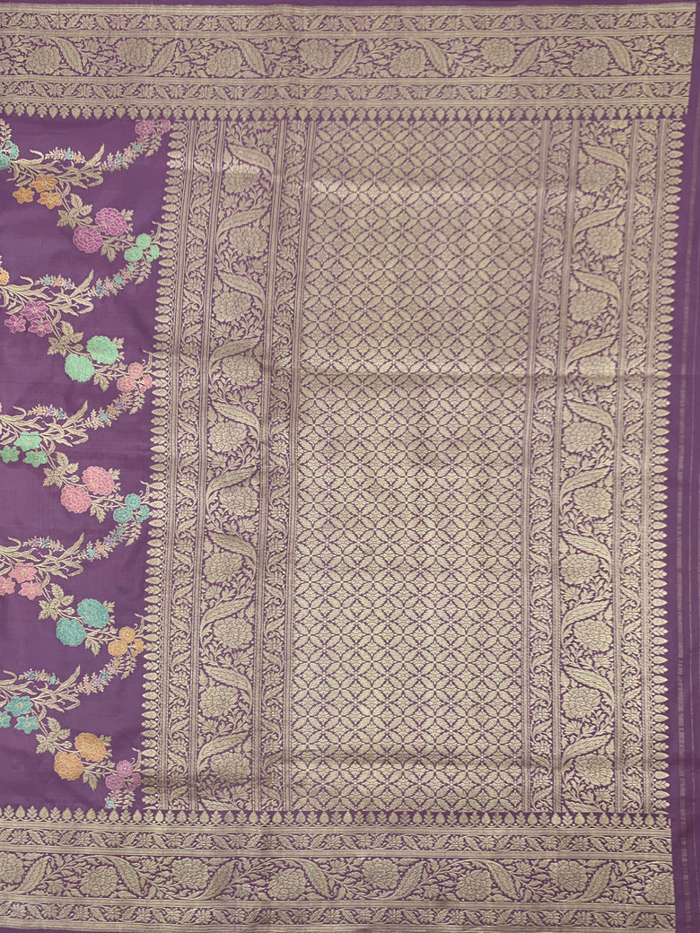 This Banarasi Kadwa Weave Silk Saree features stunning all-over gold zari and meenakari floral designs on a lilac base. The intricate floral border and brocade pallu add to its elegant appeal. Complete the look with the self-plain blouse adorned with a zari border.