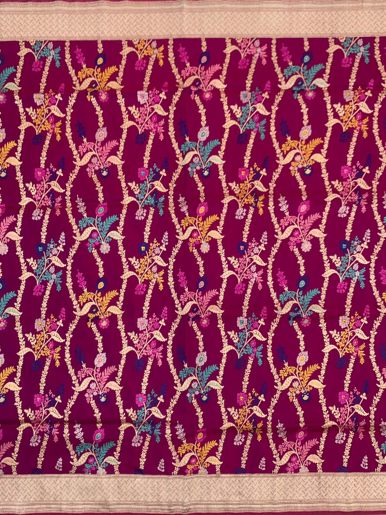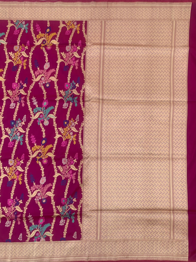 This Banarasi kadwa silk saree features a stunning combination of gold and silver zari work, intricately woven into gold jaal and silver butta designs with meenakari accents. The saree also boasts a brocade pallu and border, adorned with rich colors of Magenta-Pink and secondary colour Purple. The included blouse is plain, with brocade border.