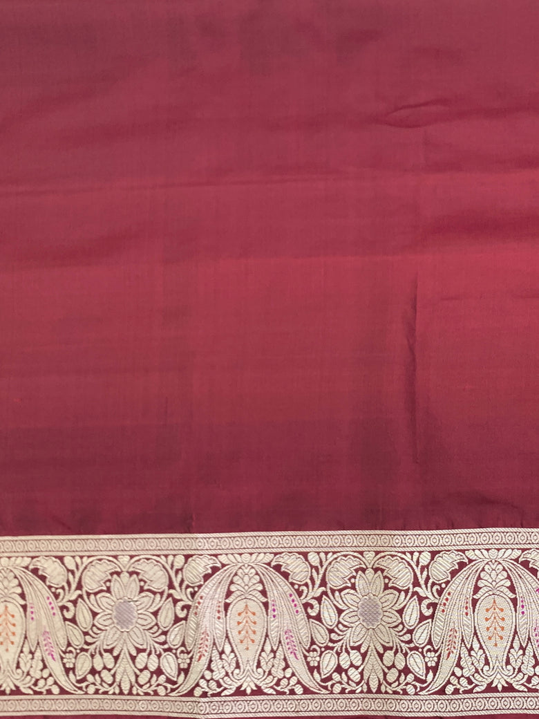This maroon Banarasi Kadwa weave silk saree showcases a stunning design, featuring a gold, silver, and meenakari floral jaal pattern all over. Its traditional floral border and pallu add to its elegance. The saree also comes with a plain self-colored blouse, complemented by a zari border.