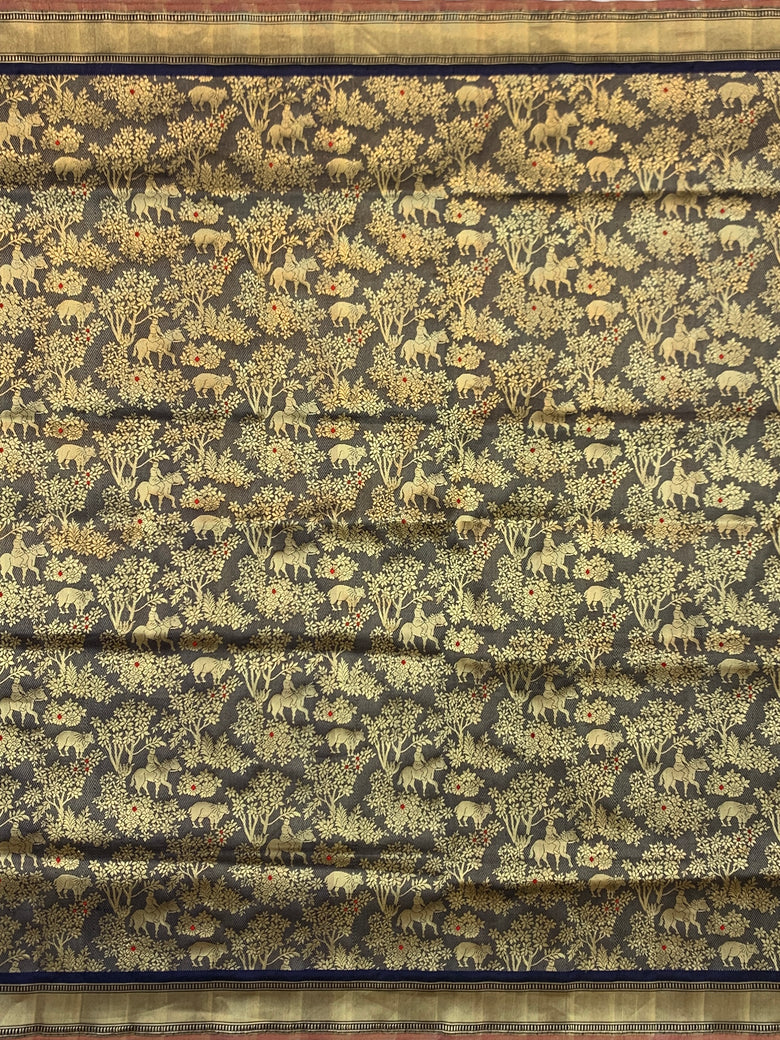 Banarasi kadwa weave silk saree features a navy-blue color, a self brocade border and pallu, and a stunning all over gold zari floral and animal motif. The accompanying blouse is self plain with a zari border.