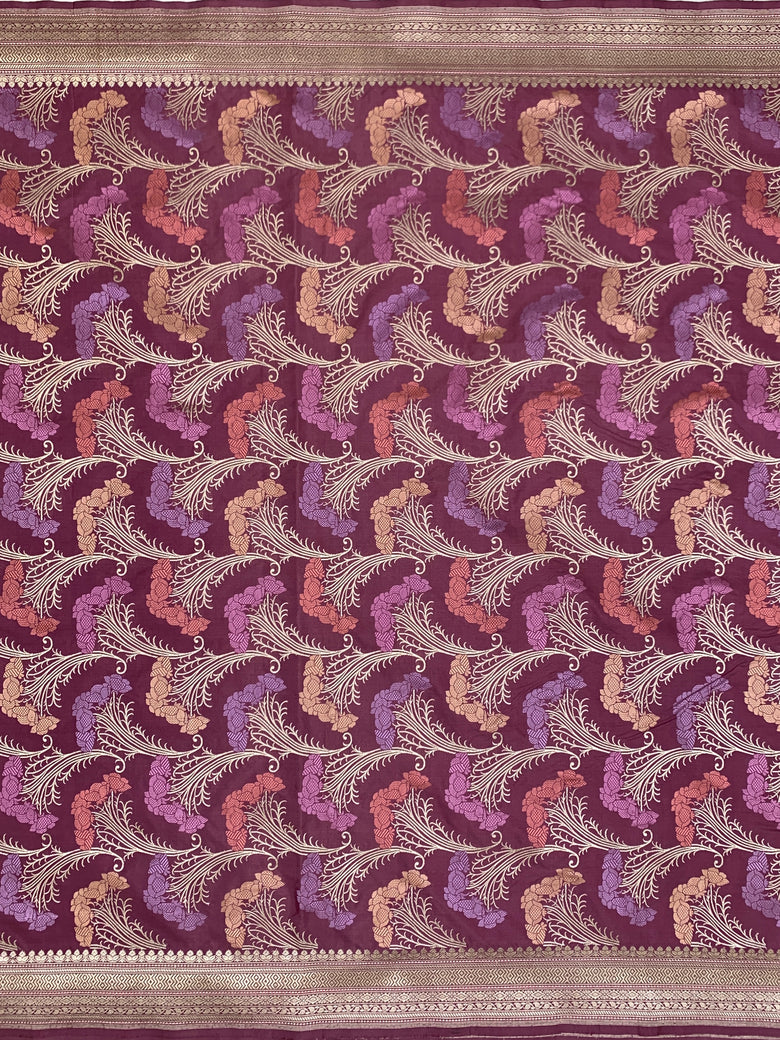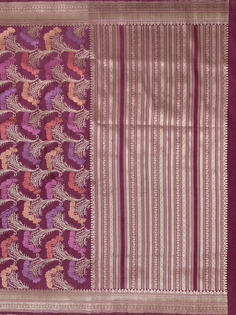 Banarasi kadwa weave silk saree features an intricate all-over gold zari and meenakari floral jaal design. It is complemented by a self brocade border and pallu, presented in a delicate onion-pink shade. The blouse is plain with a matching border, completing the elegant ensemble.