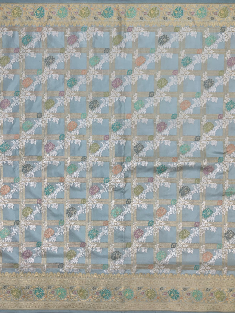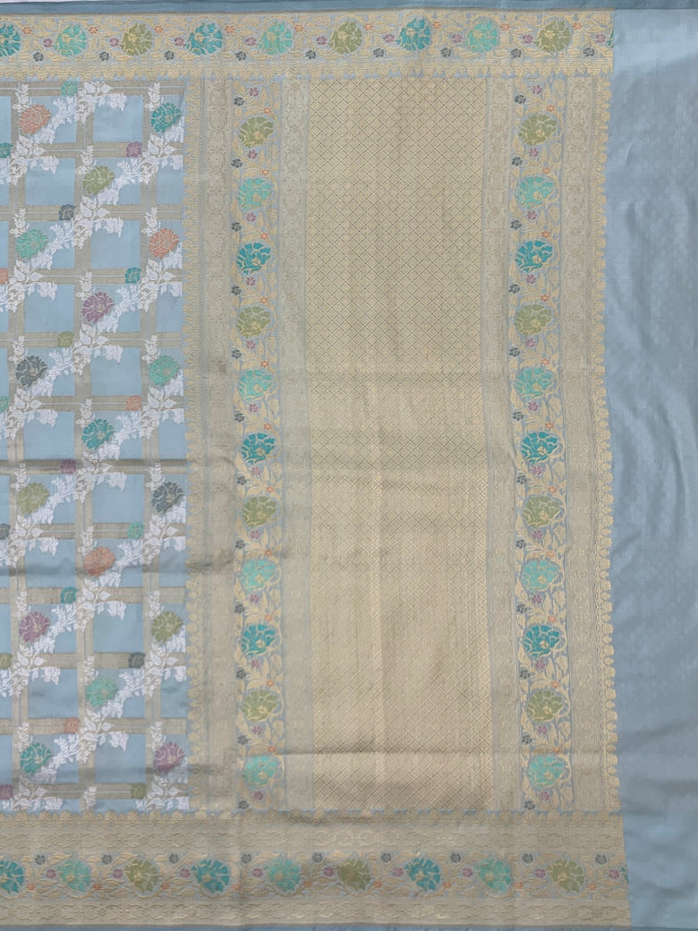 This exquisite Banarasi kadwa weave silk saree features a lavish all over gold zari checks pattern and stunning silver zari meenakari laheriya pattern on the saree, accompanied by a delicate self floral border and brocade pallu. The gorgeous powder-blue color adds a touch of elegance, while the self gold zari floral brocade blouse with zari border completes the look.