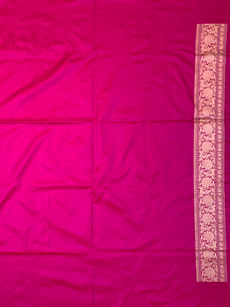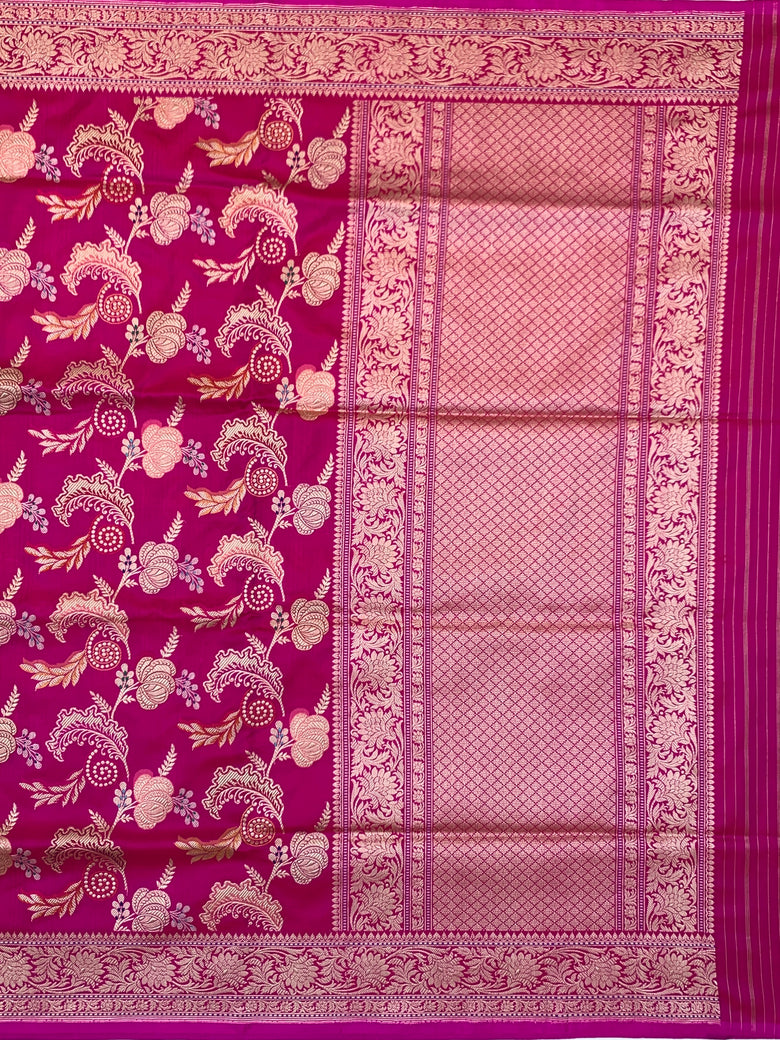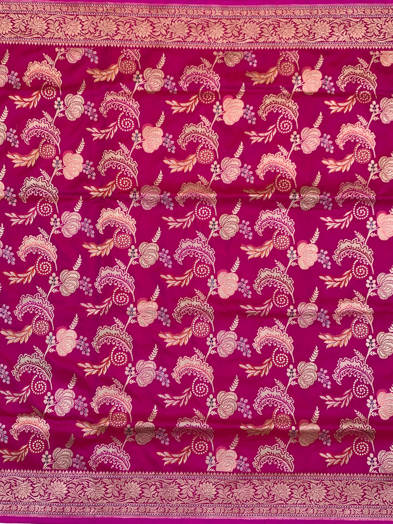 This exquisite banarasi kadwa weave silk saree features an intricate gold, silver, and meenakari floral jaal design throughout the body, bordered by self floral patterns and finished with a brocade pallu. The stunning rani-pink color is beautifully complemented by a self plain blouse with a zari border.
