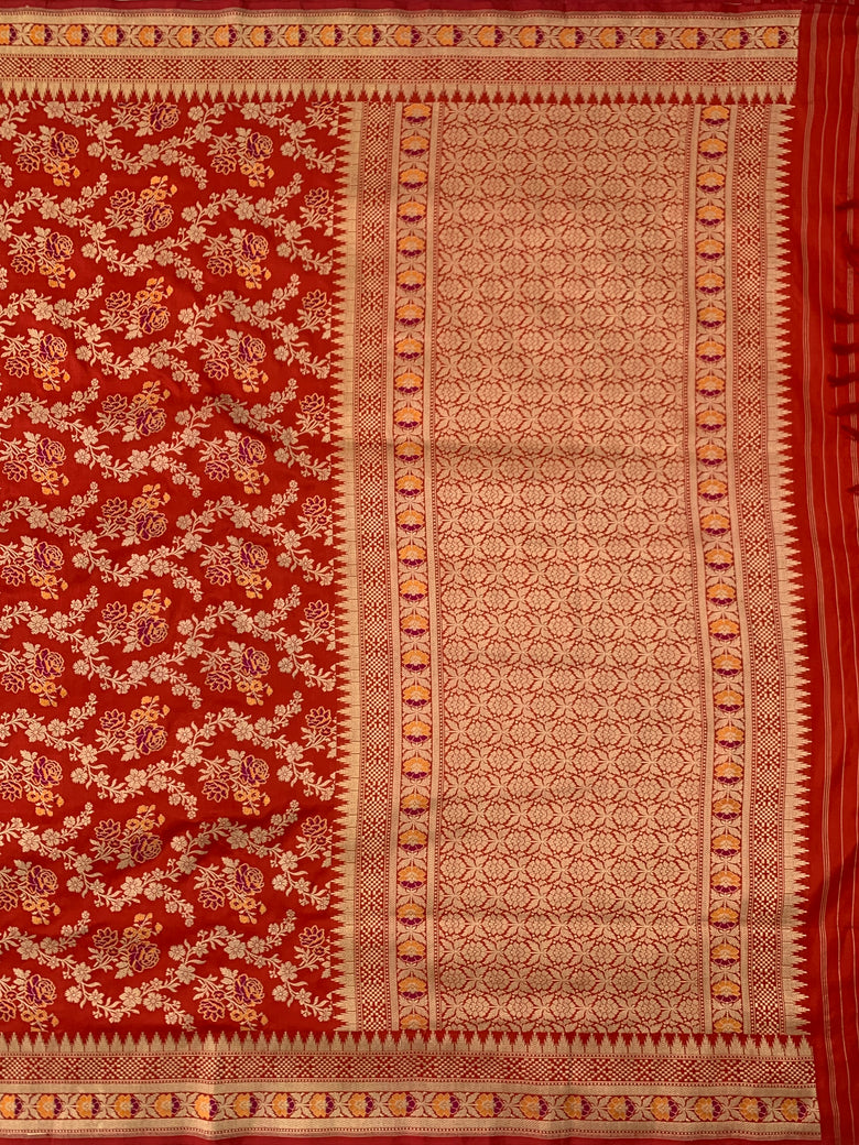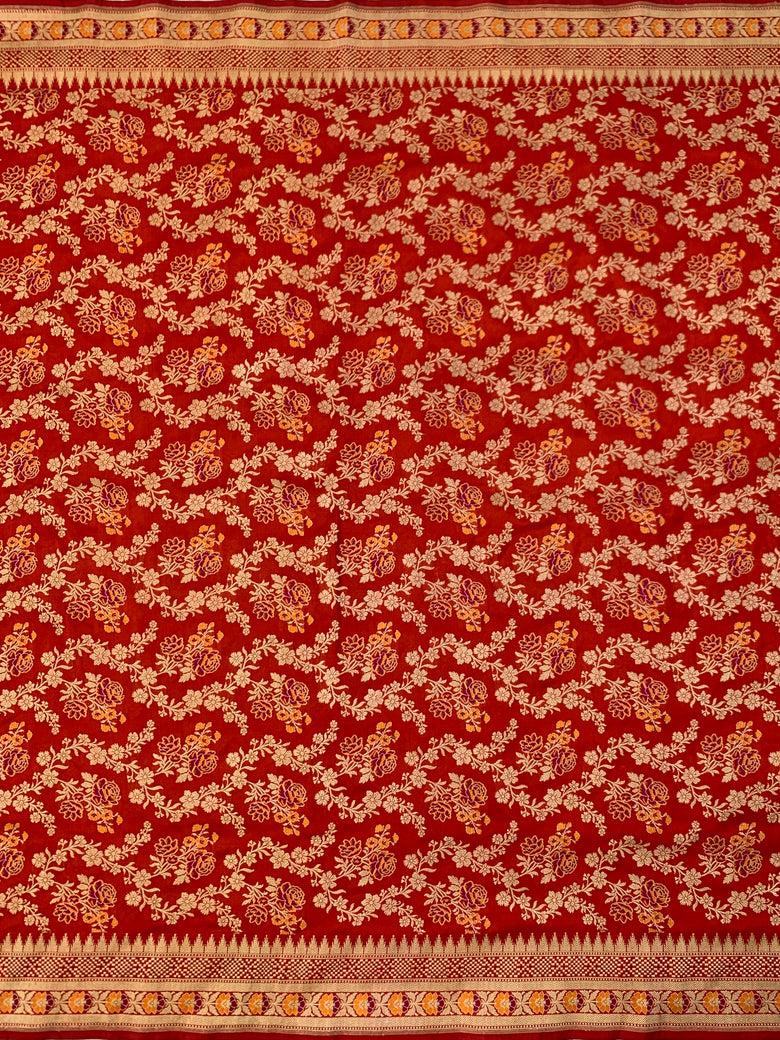 This elegant Banarasi Kadwa weave silk saree features a stunning all-over design of gold zari and meenakari floral jaal on the body. The self zari floral border and brocade design pallu in a vibrant red color add to its beauty. The saree comes with a self plain blouse with border, completing the look.