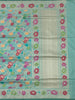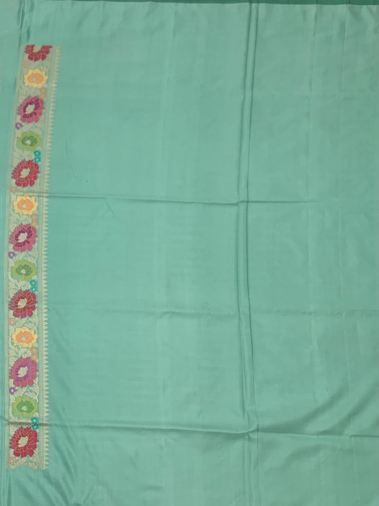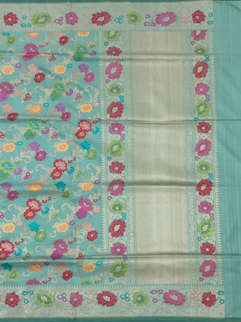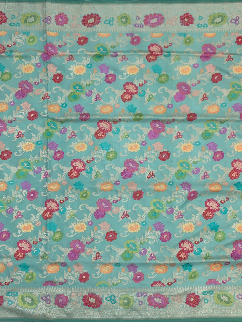 The Banarasi Kadwa Weave Silk Saree is a stunning piece with intricate silver zari and meenakari floral details, and a self floral border and brocade pallu. It features a beautiful sea-green color and comes with a self-plain blouse with a floral border.