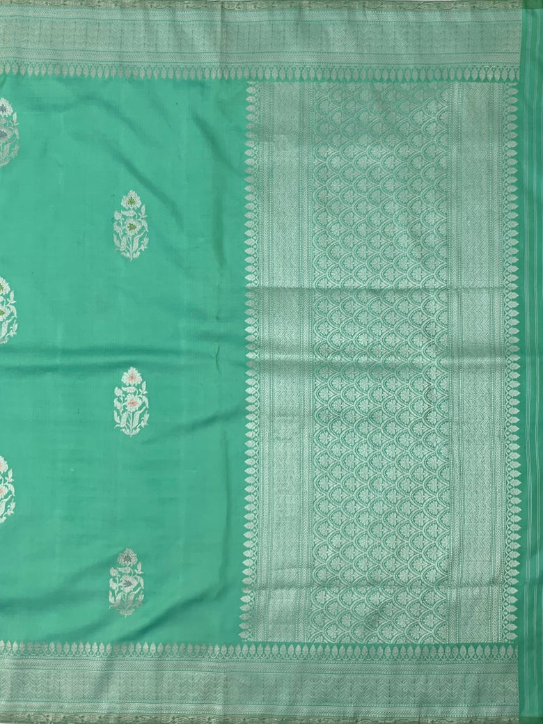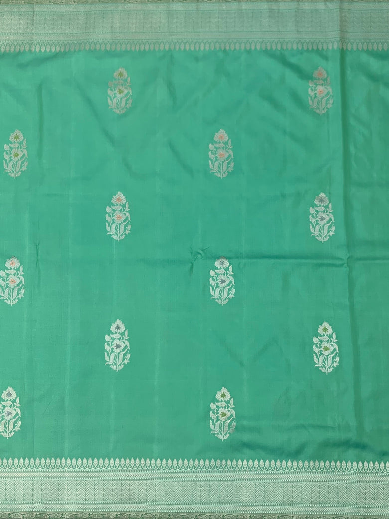 Banarasi kadwa weave silk saree features delicate silver zari and meenakari floral buttis throughout the fabric. The sea-green color is complemented by a self floral border and a brocade pallu. The contrast blouse with silver zari stripes adds a touch of elegance.