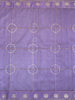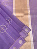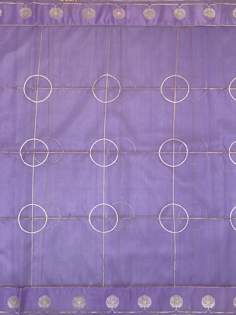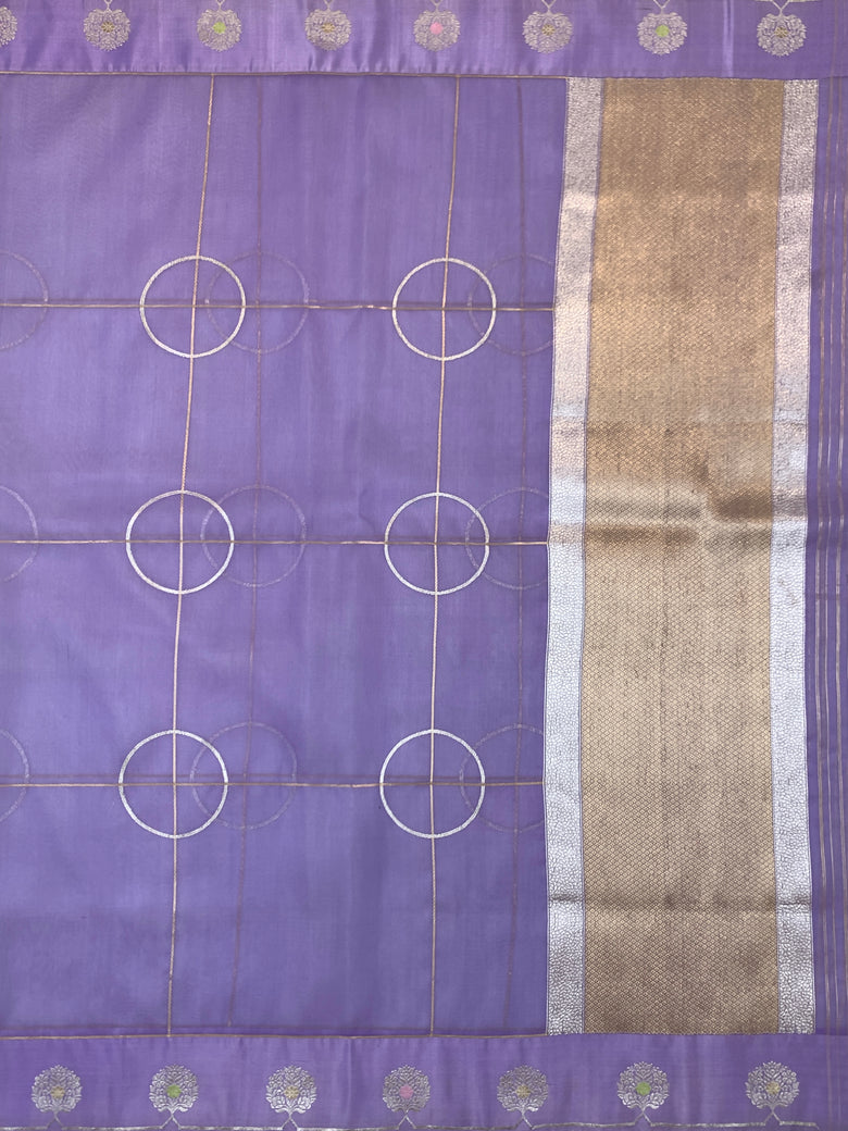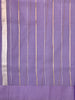 The Lavender-colored Banarasi Kora Saree features a gold and silver zari geometrical design throughout the weave, with contrasting silk fabric floral buttis on the border and a self brocade pallu. The blouse is adorned with self stripes and a border for a sophisticated touch.