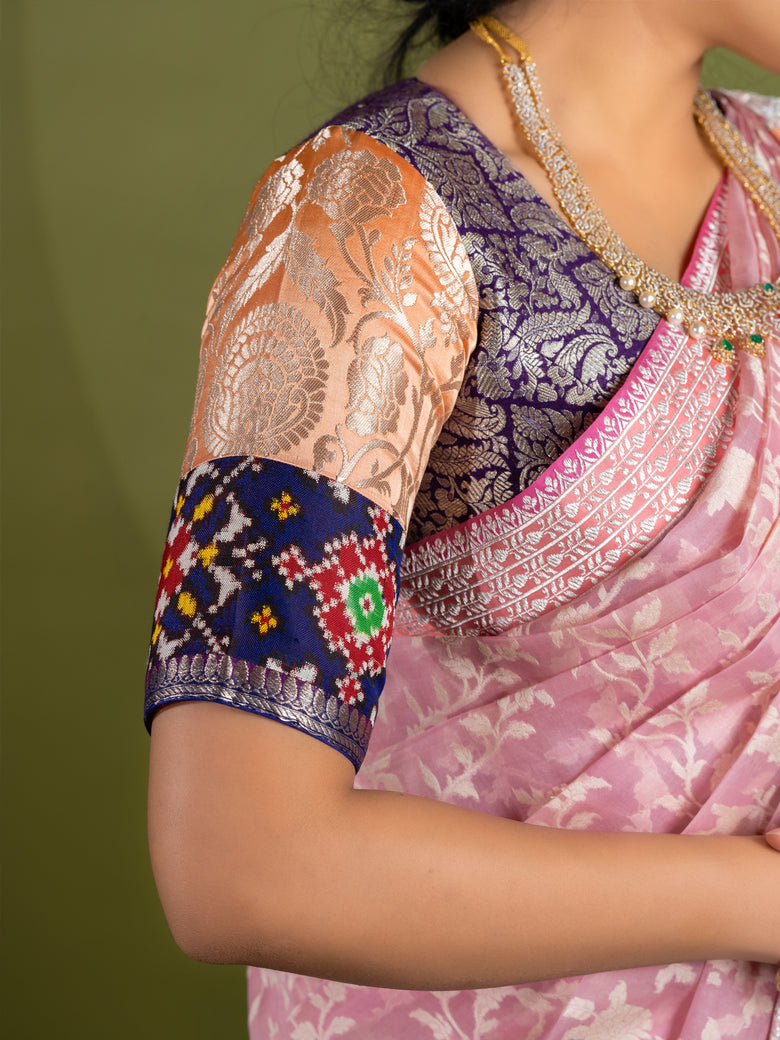 Fusion purple colour banarasi silk blouse features an intricate gold zari floral jaal design and a contrast patan patola border for a stunning and unique look.