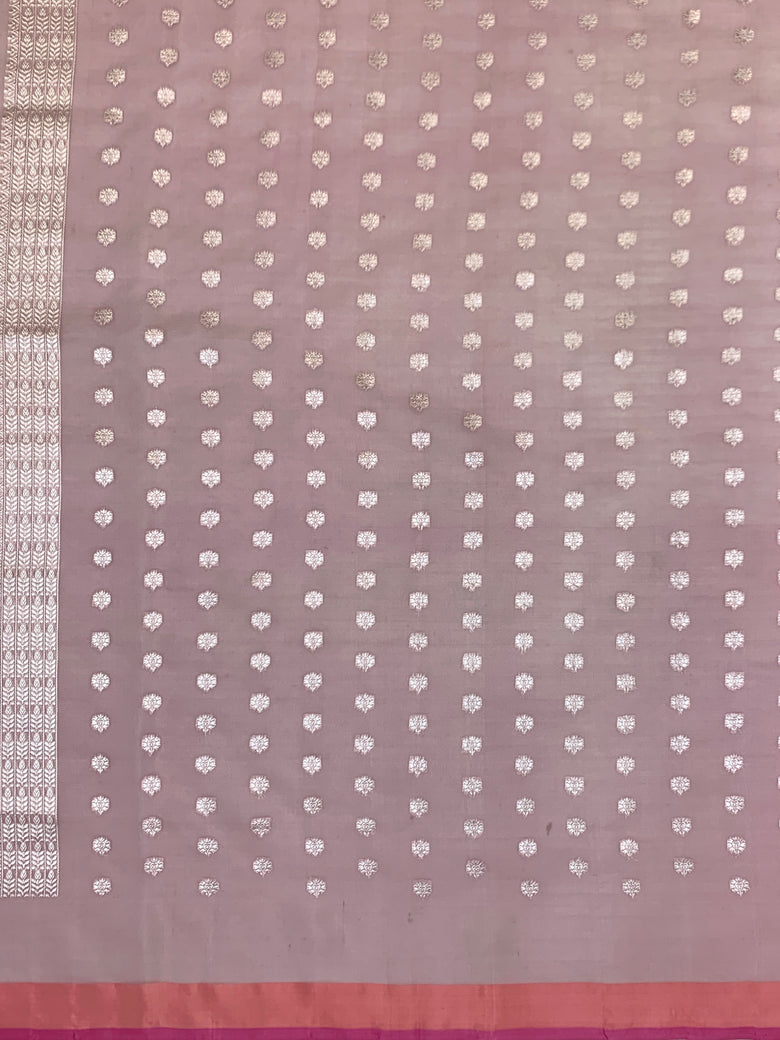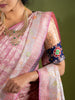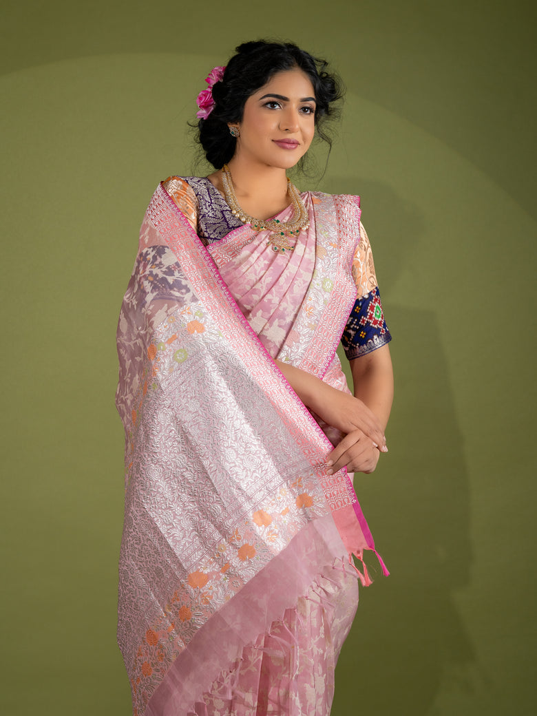 Banarasi kora saree is adorned with intricate floral jaal thread work all over, featuring a complementary silver zari floral border and pallu. Its light pink color adds a delicate touch to the overall design. The saree also comes with an unstitche blouse piece, embellished with self floral buttis and a matching border.