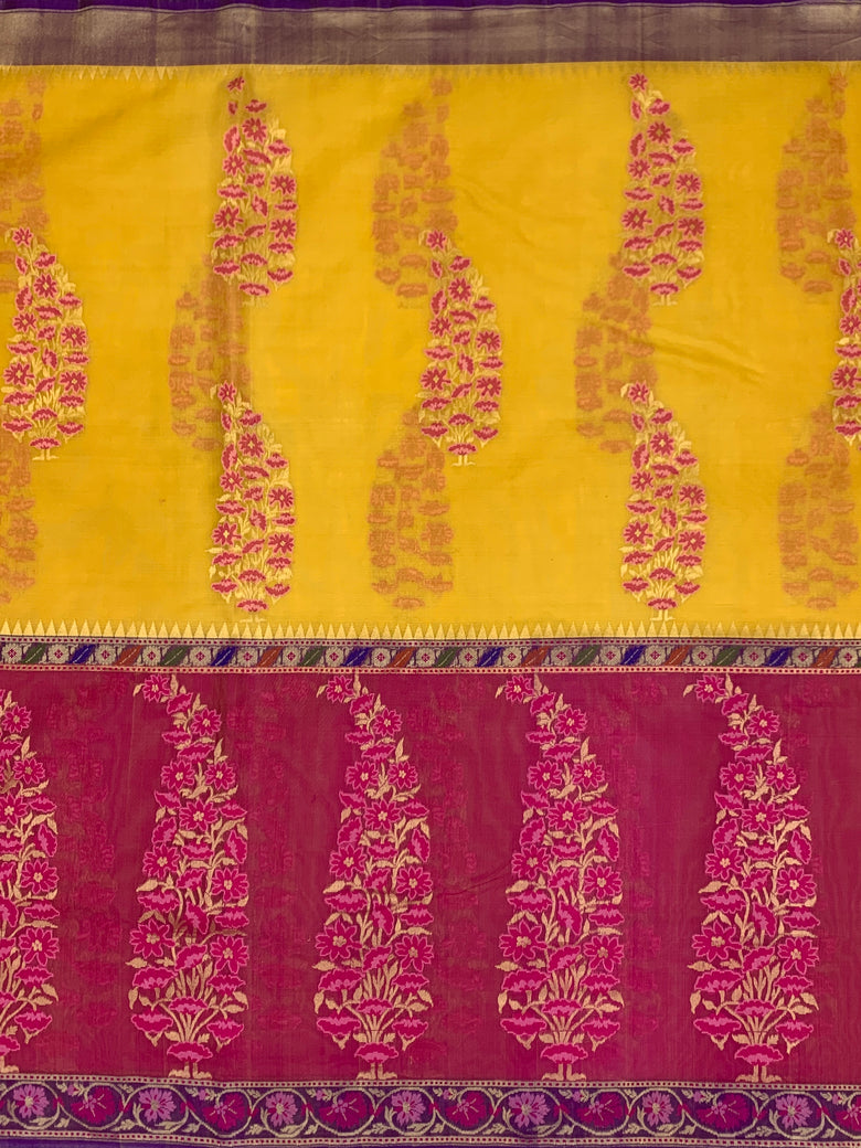 This mango-yellow banarasi kora saree showcases an all-over jamdani weave featuring gold zari and meenakari floral buttis. It is highlighted by a contrasting large floral border and a floral pallu. The blouse complements the look with a contrasting floral pattern and bordered design, offering a sophisticated and elegant finish.