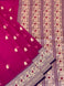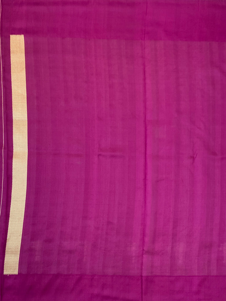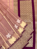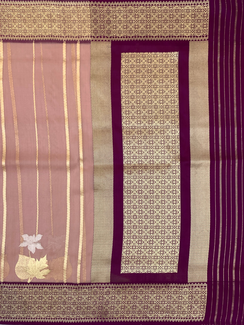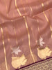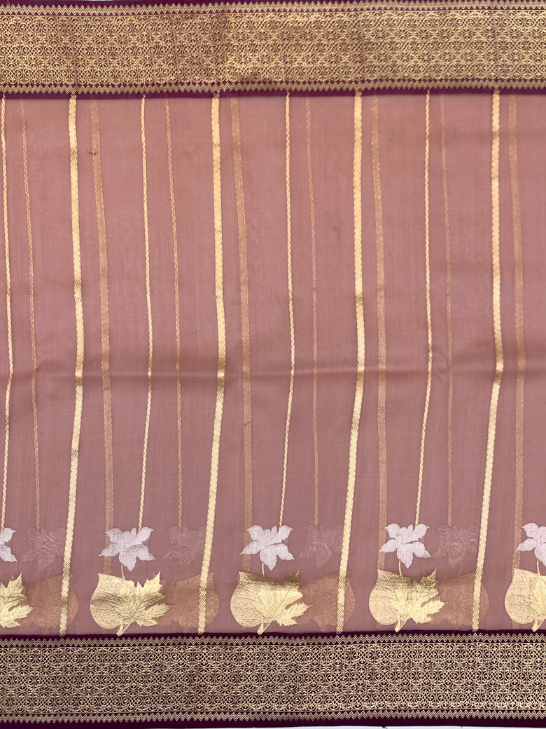 The Banarasi Kora Saree features a classic weave of all-over gold zari stripes and intricate floral buttis. The contrasting brocade border and pallu add elegant touches to the mauve color. The blouse is made of contrast silk fabric with a zari border, completing the overall look with a touch of royalty.
