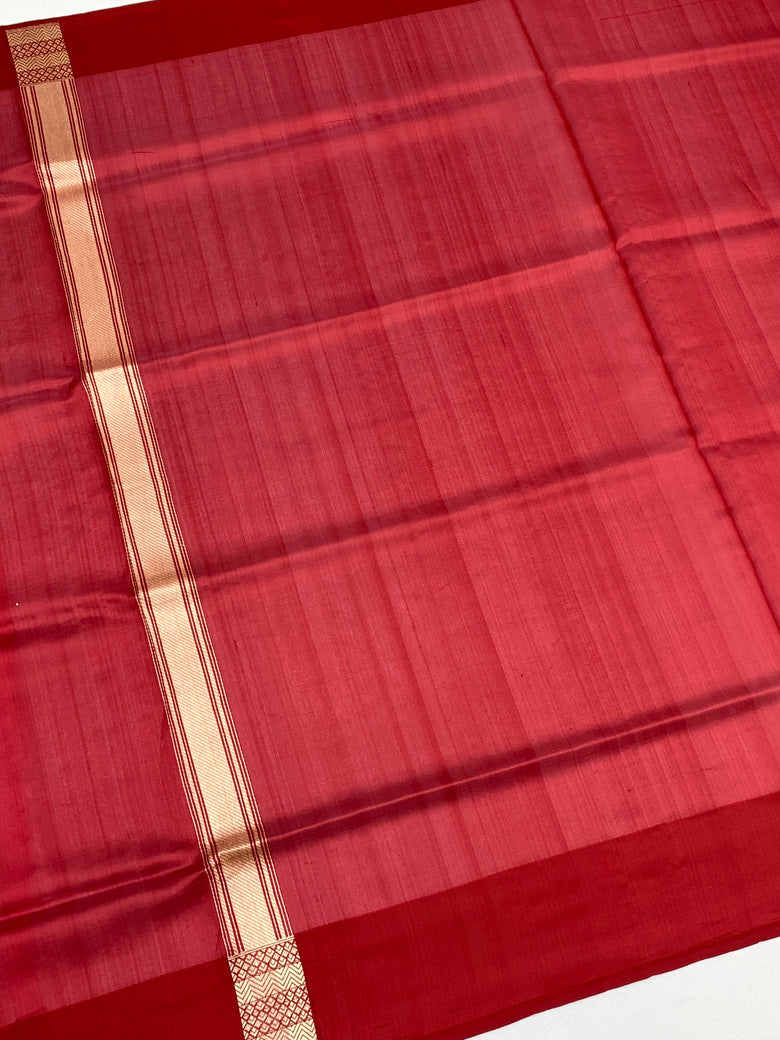 The Blouse: This saree comes with a solid Maroon silk blouse piece, featuring a coordinated zari border to match the saree's hemline.