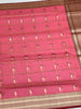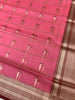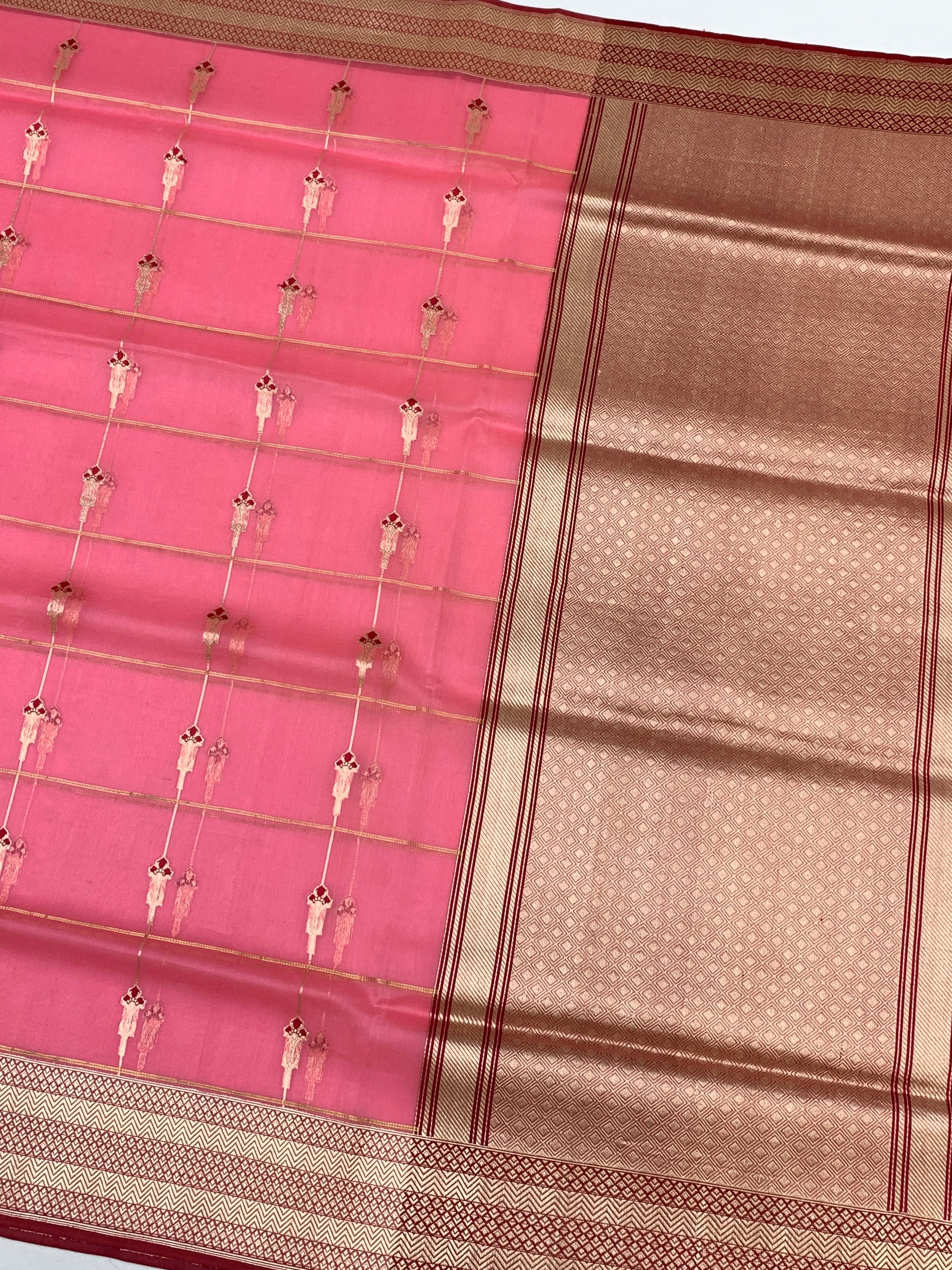 The Body: A delicate Rose Pink base featuring a unique linear grid pattern adorned with intricate zari buttas.