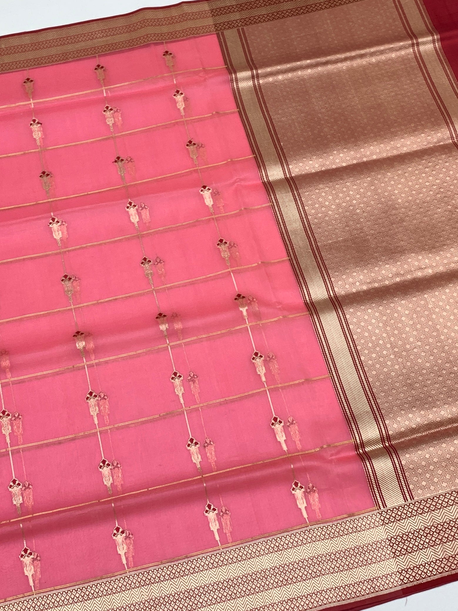 The Border & Pallu: A majestic transition into deep Maroon and Gold Zari. The pallu is densely woven with geometric diamond patterns, giving it a rich, metallic sheen.