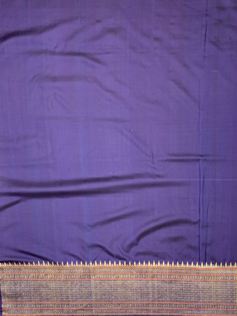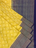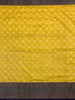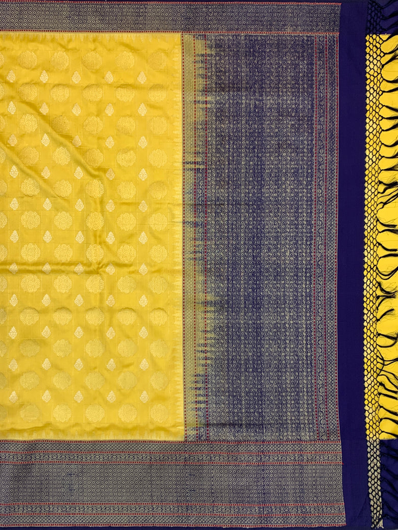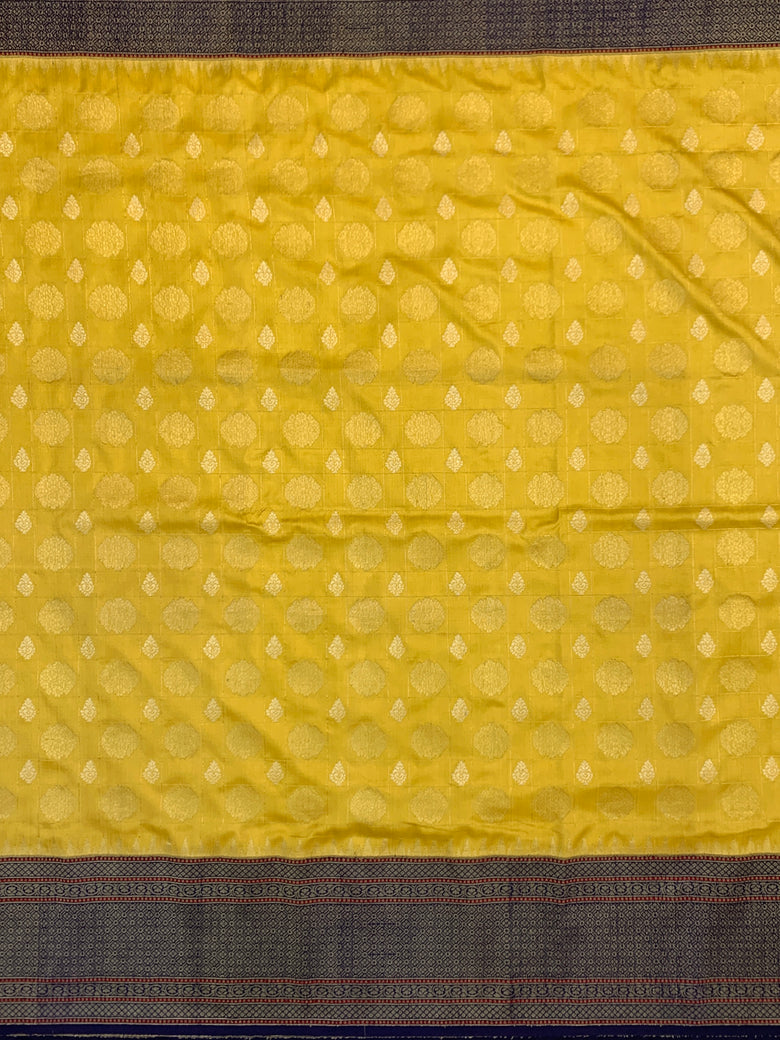 This elegant iktara banarasi silk saree boasts a stunning weave featuring gold zari checks and silver and gold zari floral designs. The saree is accentuated with a contrasting brocade border and pallu, while the vibrant yellow color adds a pop of color. The blouse is a plain contrast with a zari border.
