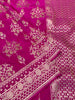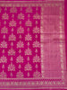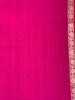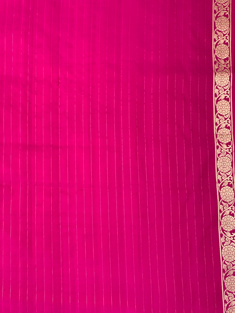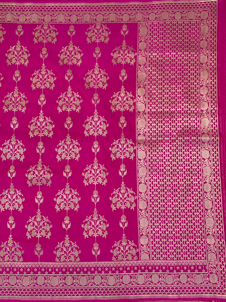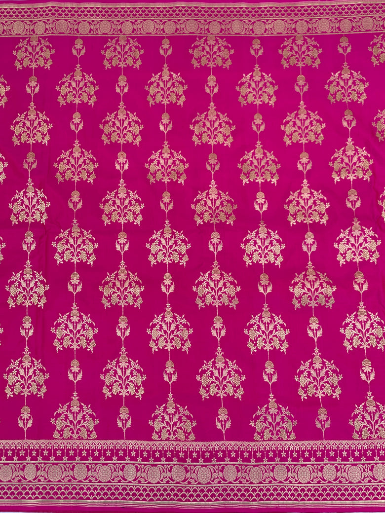 This pink Satin Banarasi Silk Saree features a handwoven design with intricate All over gold zari and colorful meenakari floral buttas on the body. It also includes a self floral border and pallu, along with a matching self plain blouse with zari border.