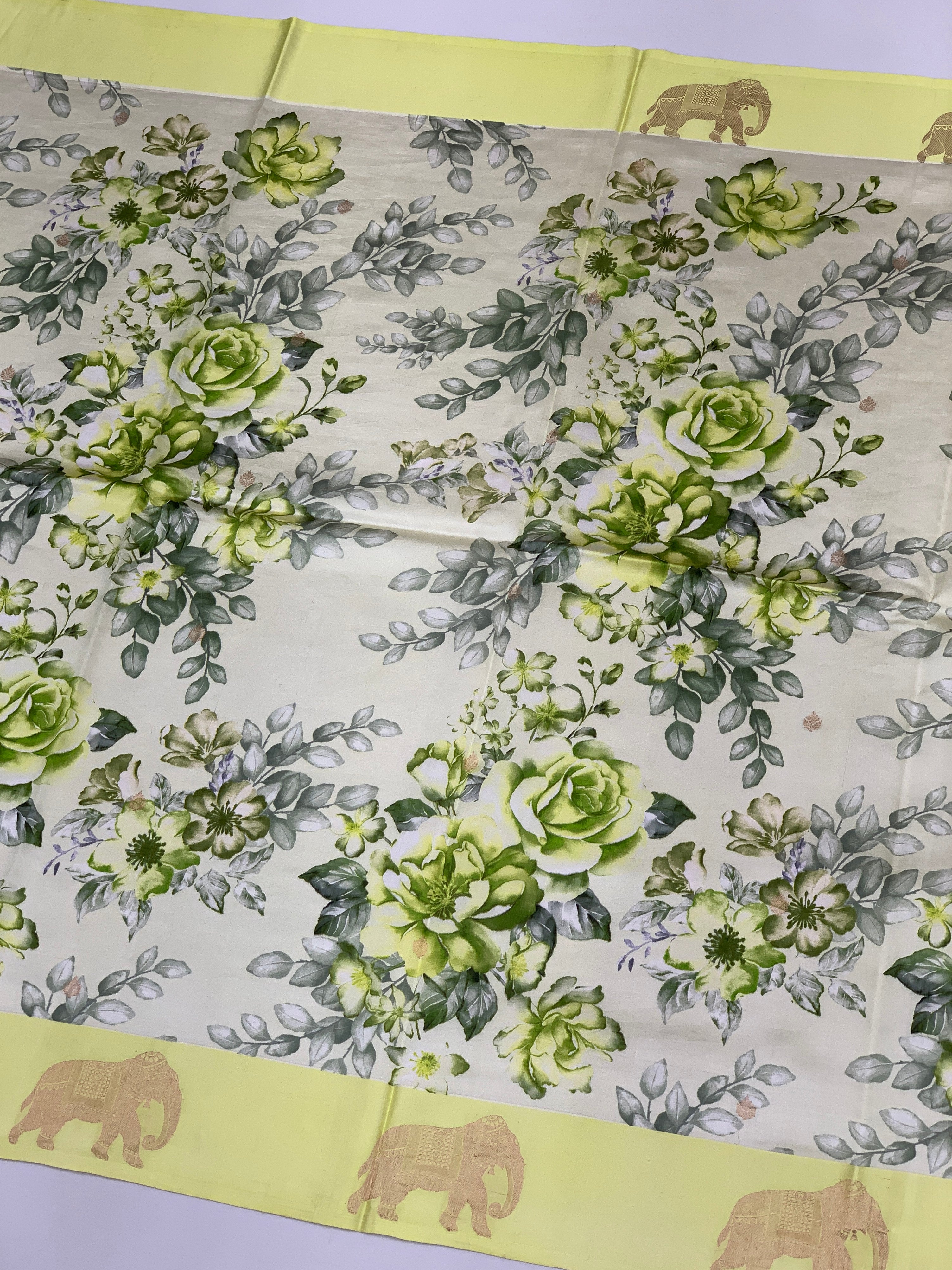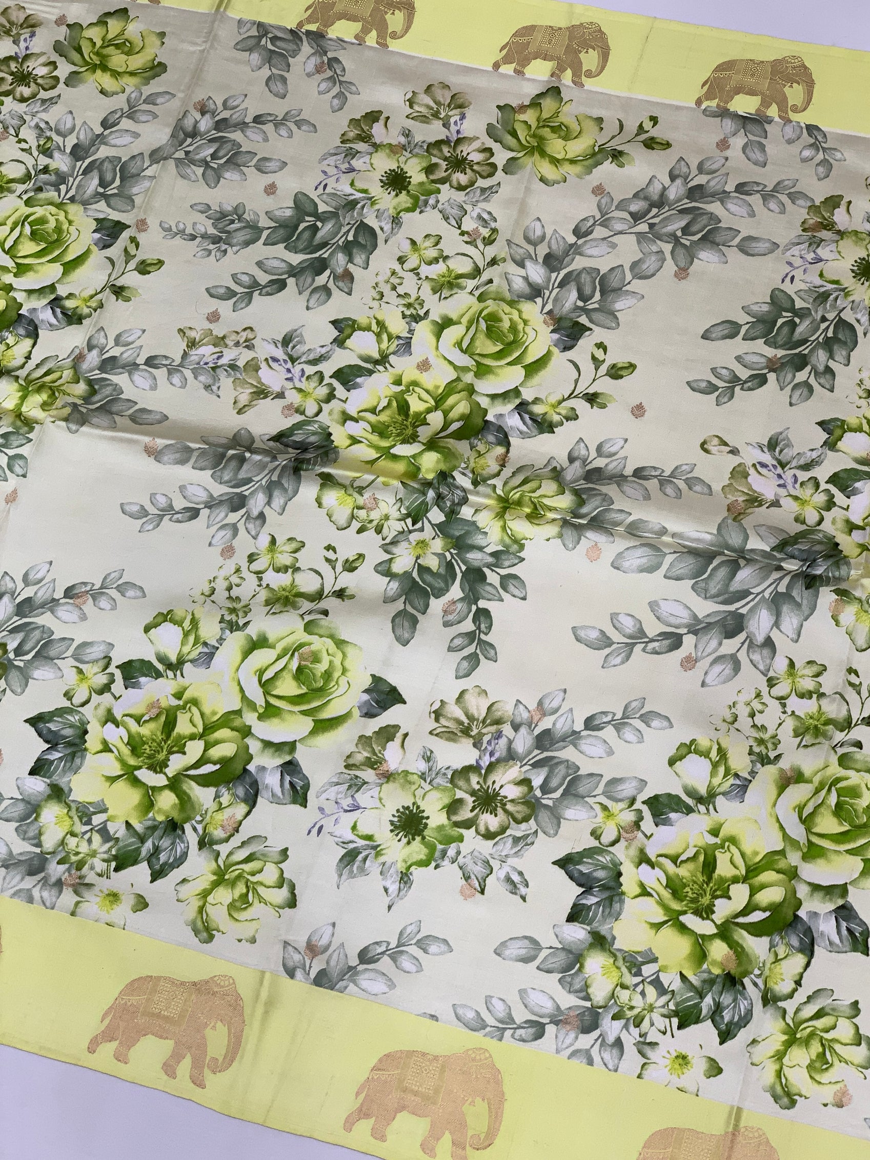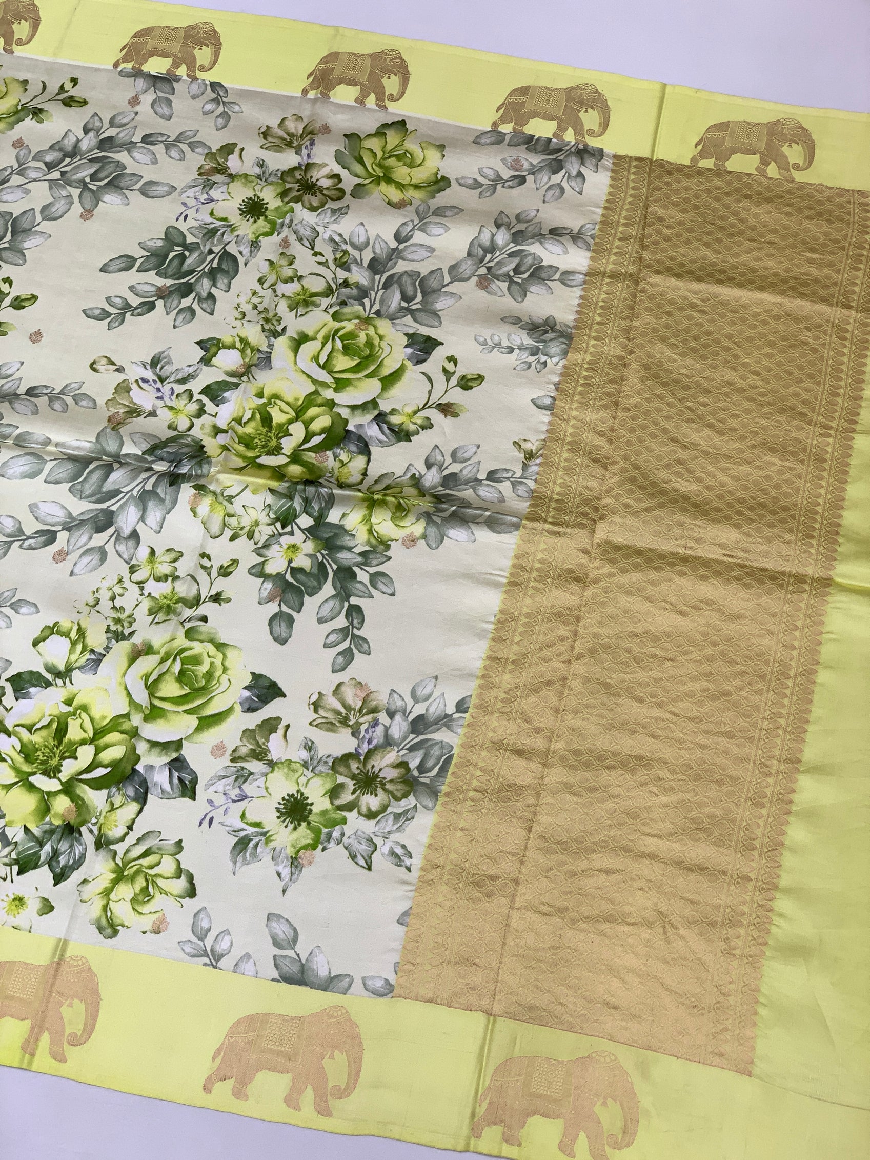 This light-green Chanderi silk saree showcases an intricate all-over floral print enhanced by gold zari floral buttis. Its standout feature is a contrasting border decorated with gold zari elephant motif buttis, complemented by a brocade pallu. The blouse is crafted with a matching floral print and zari designs, finished elegantly with a coordinating border.