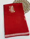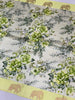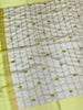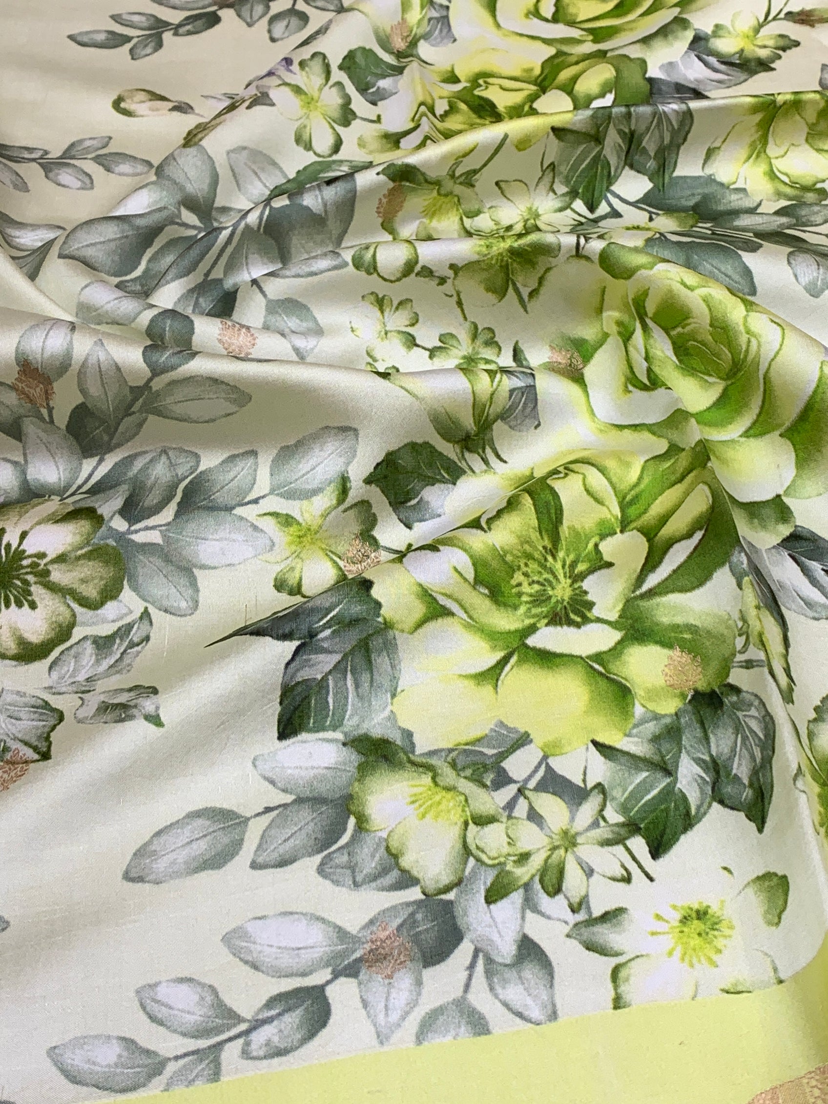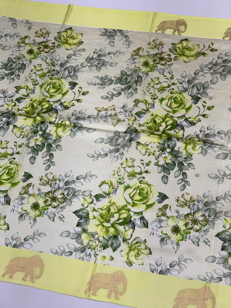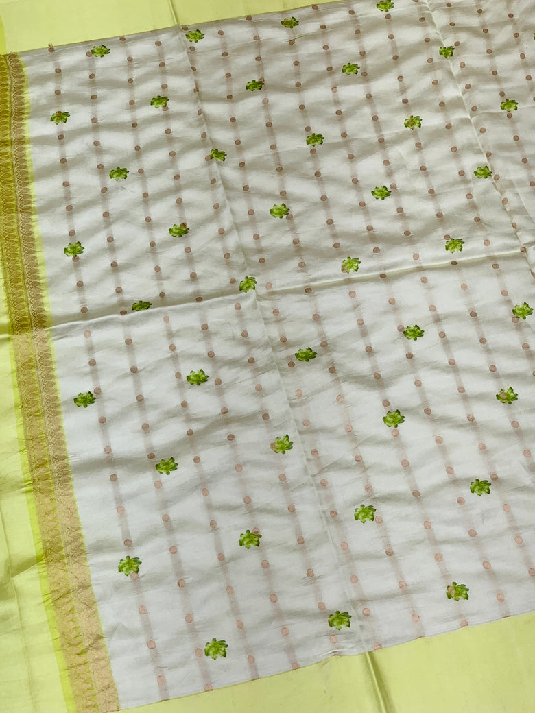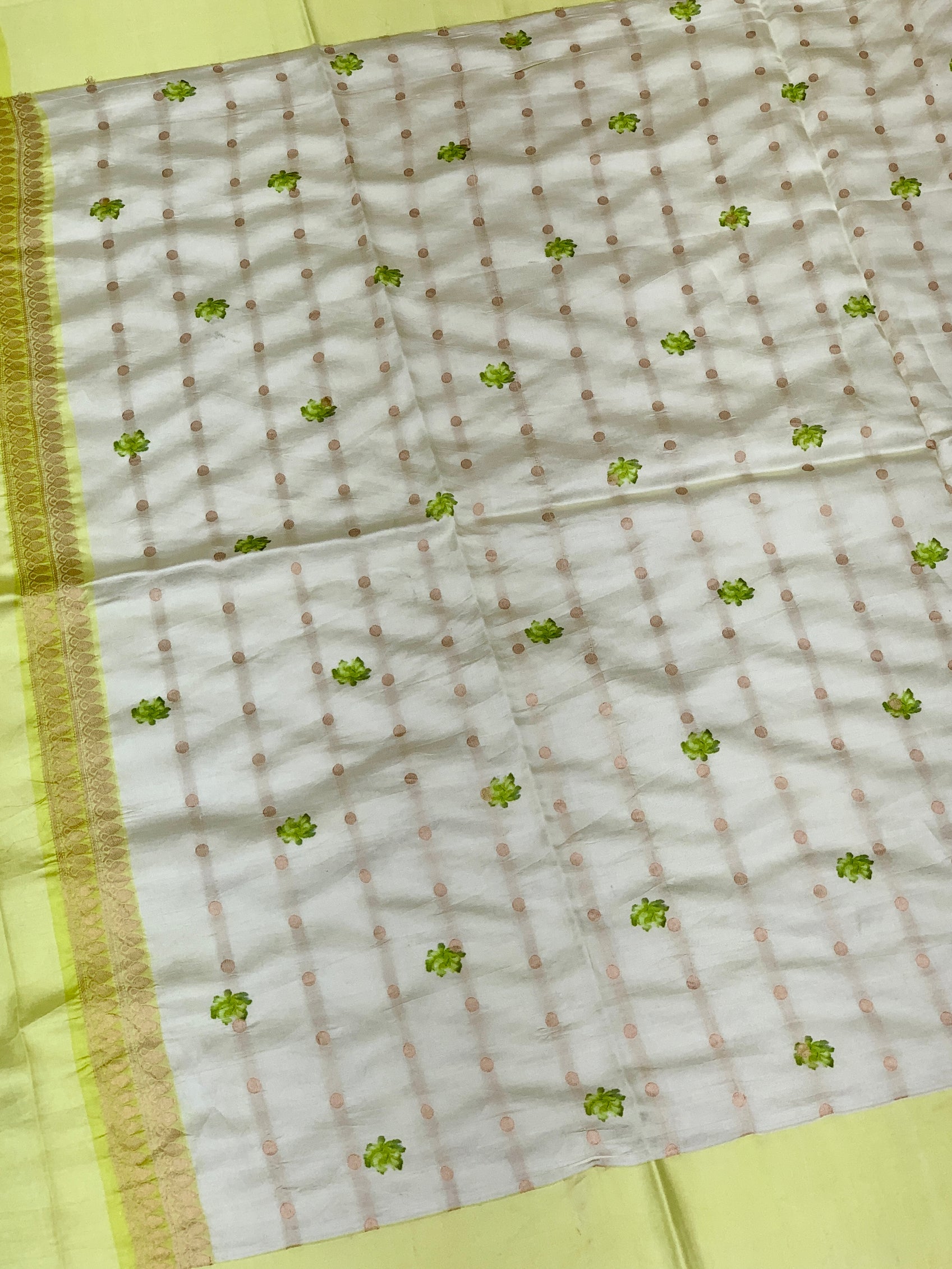 This light-green Chanderi silk saree showcases an intricate all-over floral print enhanced by gold zari floral buttis. Its standout feature is a contrasting border decorated with gold zari elephant motif buttis, complemented by a brocade pallu. The blouse is crafted with a matching floral print and zari designs, finished elegantly with a coordinating border.