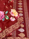 Chanderi silk saree features an all-over floral print complemented by gold and silver zari floral buttis. It is adorned with a contrasting floral border and pallu in turquoise-blue. The blouse is self-printed with floral patterns, enhanced by zari stripes and a matching border.