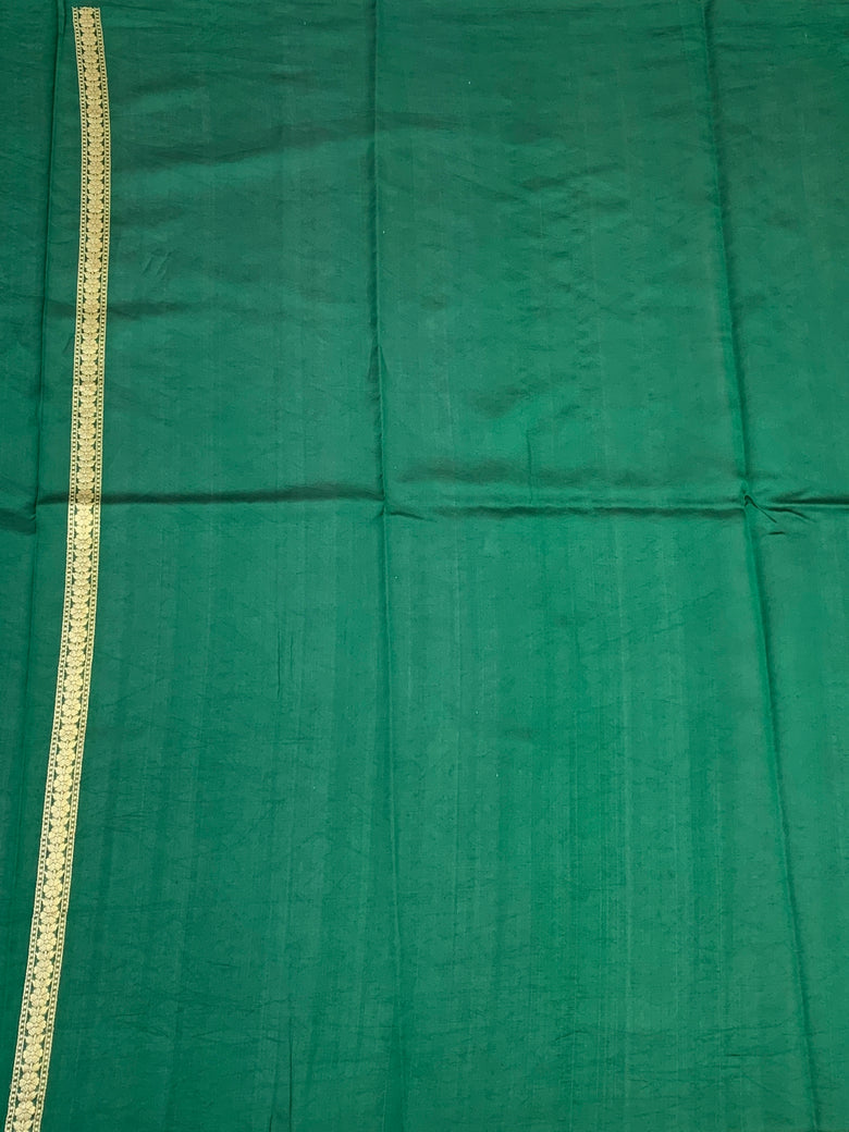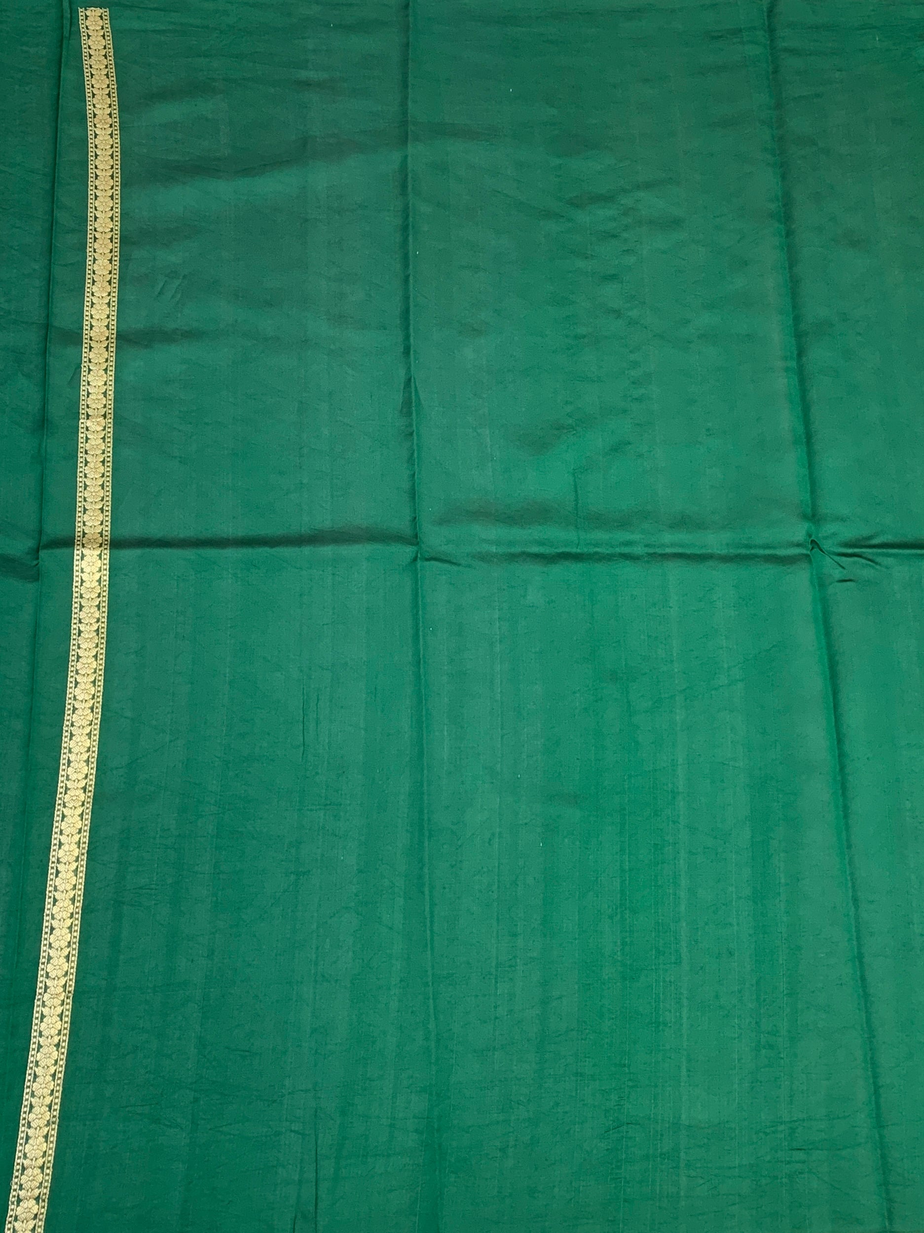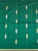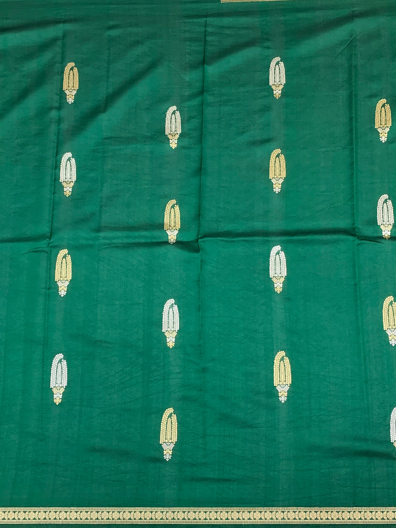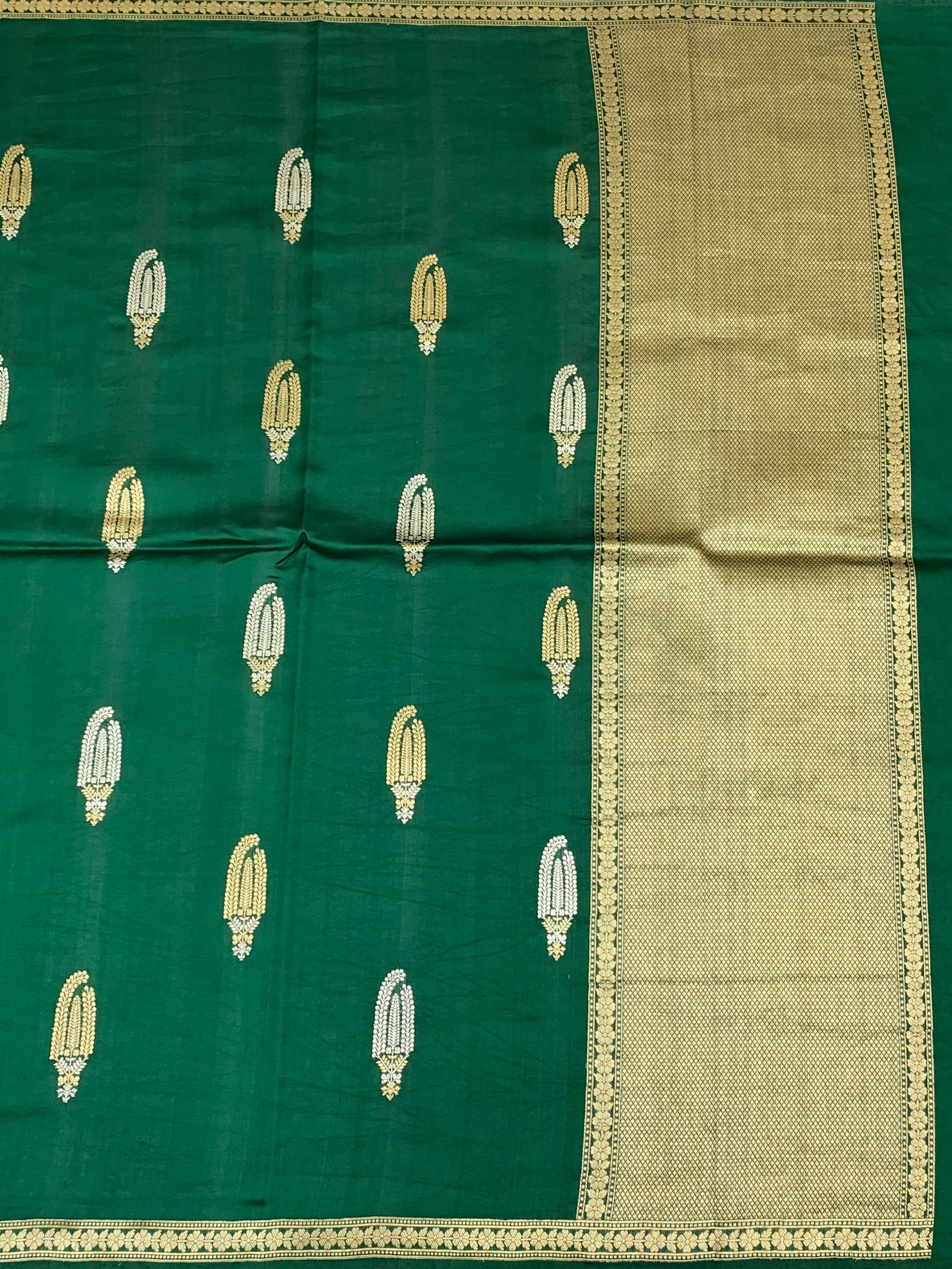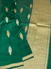This bottle-green chanderi silk saree features an intricate all-over weave of gold and silver zari floral buttis. It is adorned with a delicate self-floral border and a richly brocaded pallu. The matching blouse is plain with a coordinating border, completing the elegant ensemble.