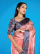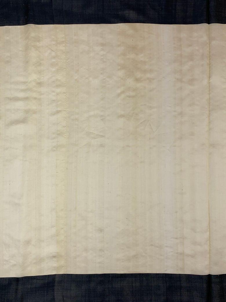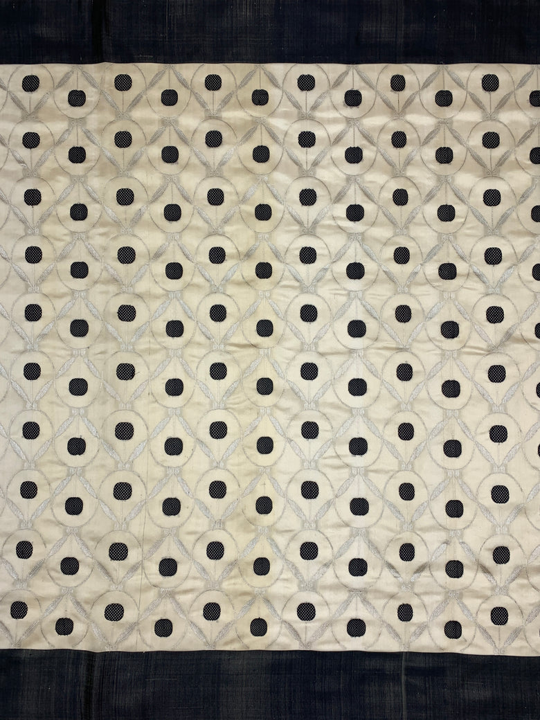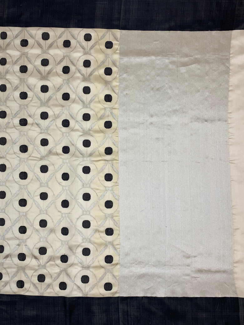 Cream-colored chanderi silk saree is adorned with delicate floral jaal created from silver zari and thread work across the fabric. It features a contrasting plain border and a self-brocade pallu. The blouse is plain with a matching border, completing the elegant ensemble.