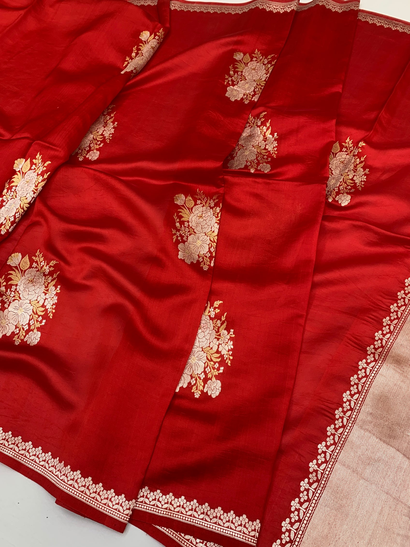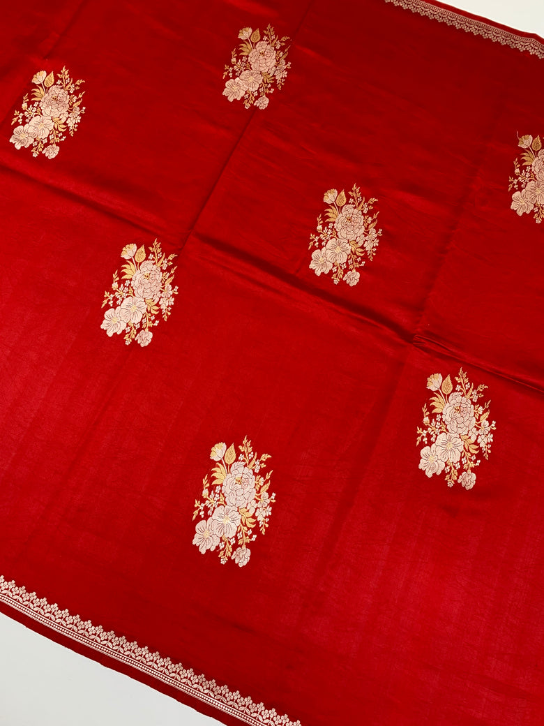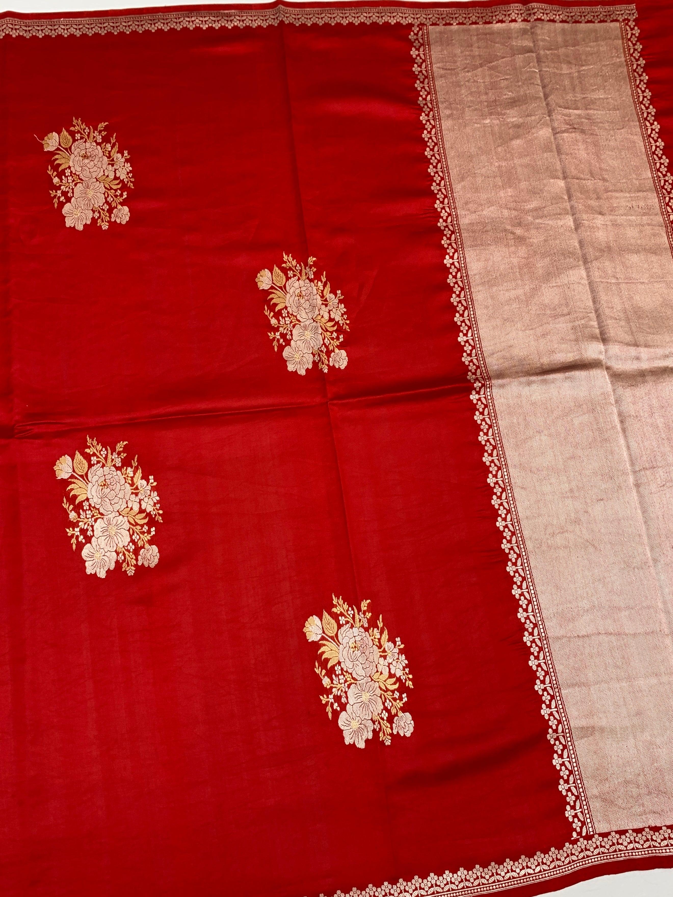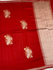 Embrace timeless elegance with this exquisite deep-red Chanderi silk saree, a masterpiece of traditional Indian craftsmanship. The rich crimson hue creates a stunning canvas for the intricate silver and gold zari work that adorns the fabric.