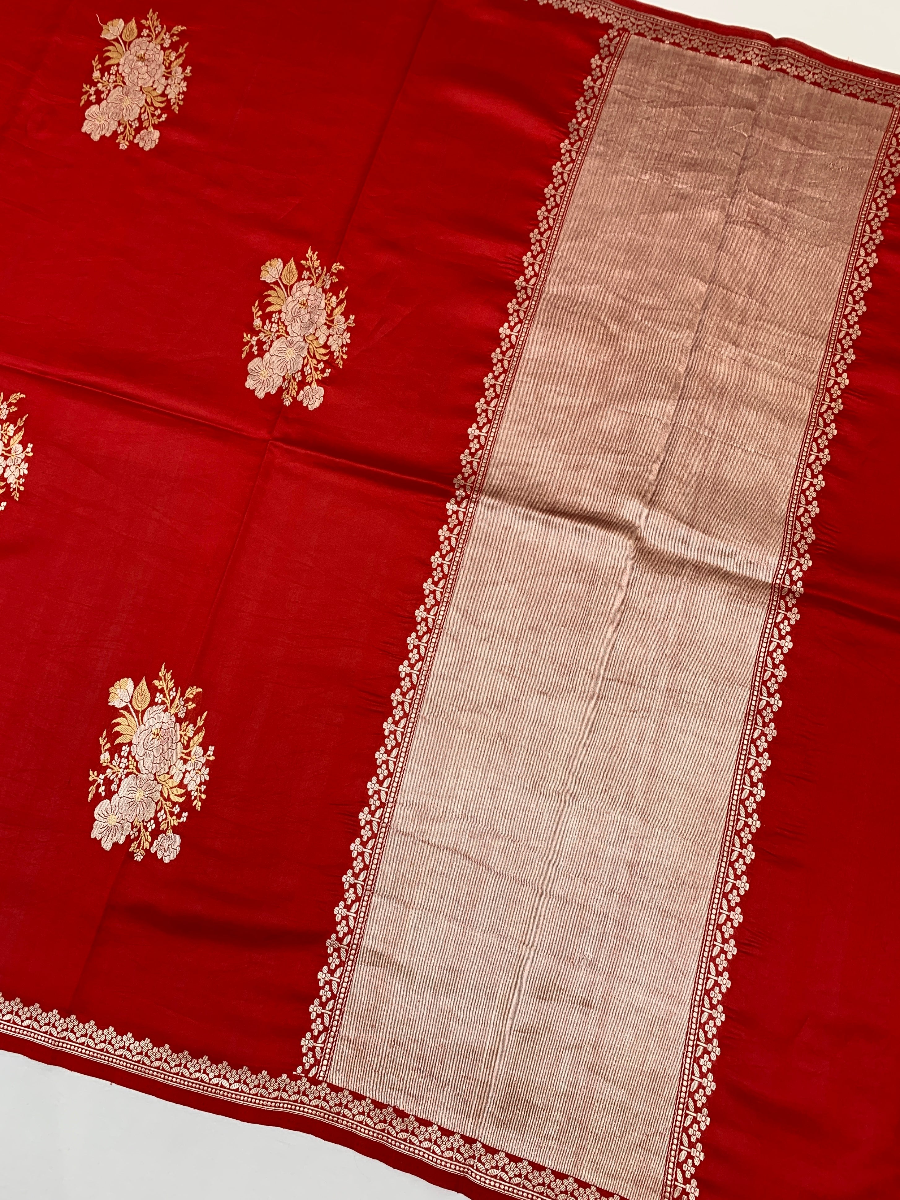 - Intricate Zari Work: Delicate silver and gold zari floral buttas meticulously woven across the body, creating a rich, textured appearance.