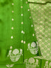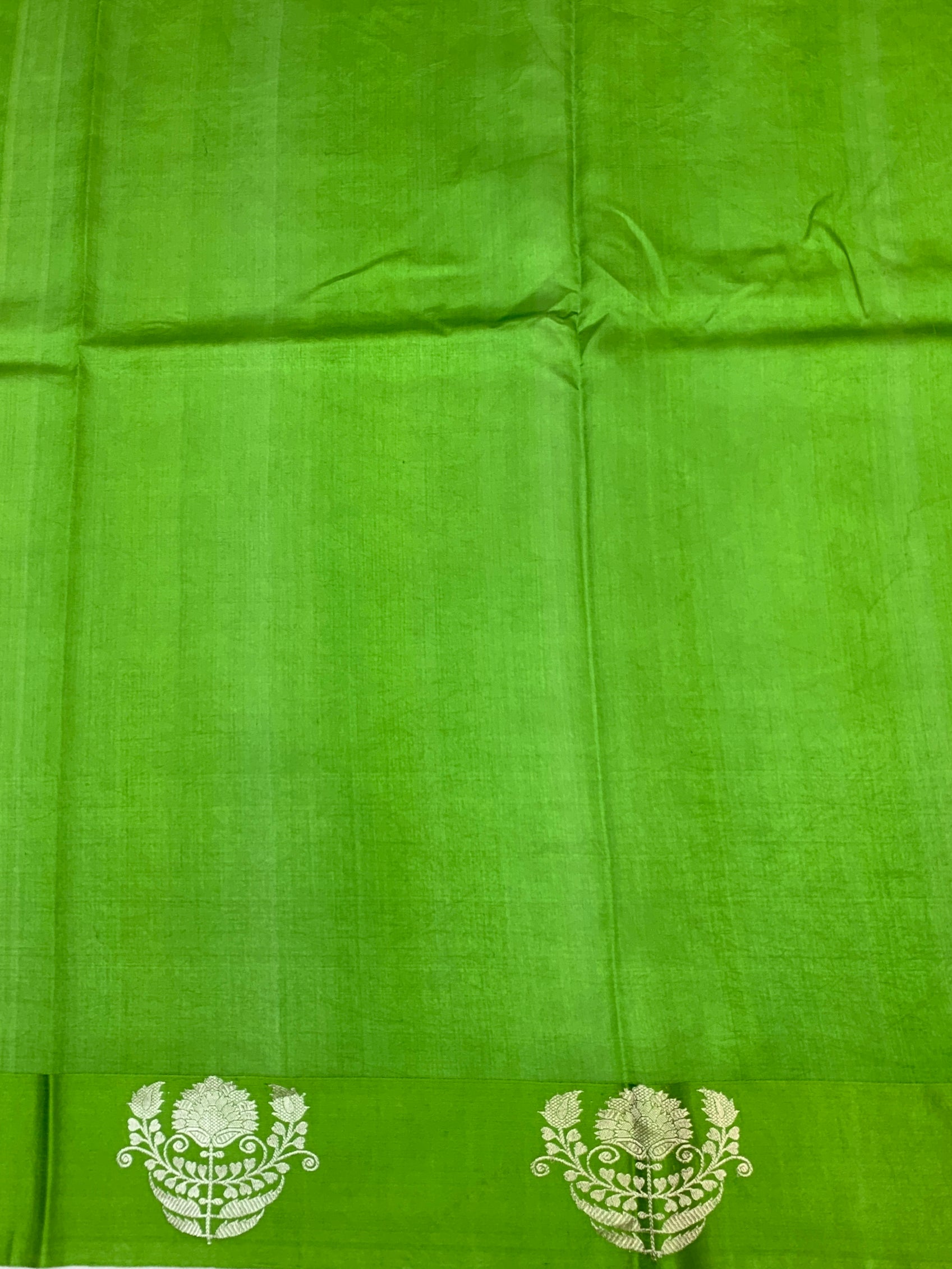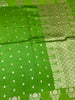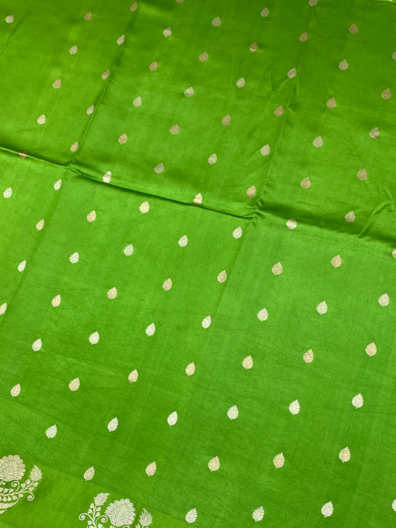 Green chanderi silk saree features an intricate all-over silver zari floral butti weave, complemented by a self-designed floral border and a richly brocaded pallu. The blouse is plain with a matching border.