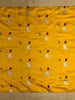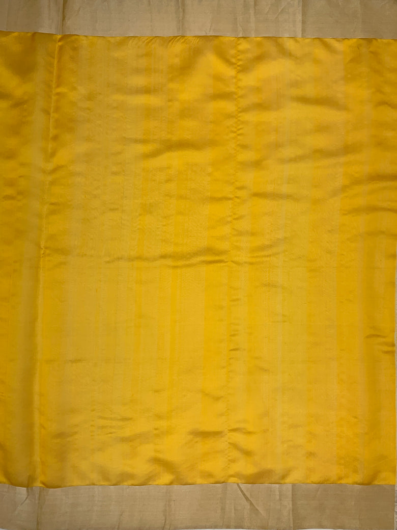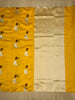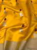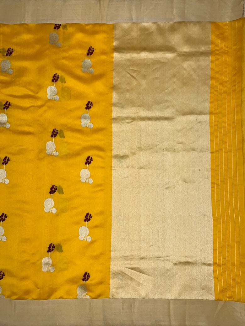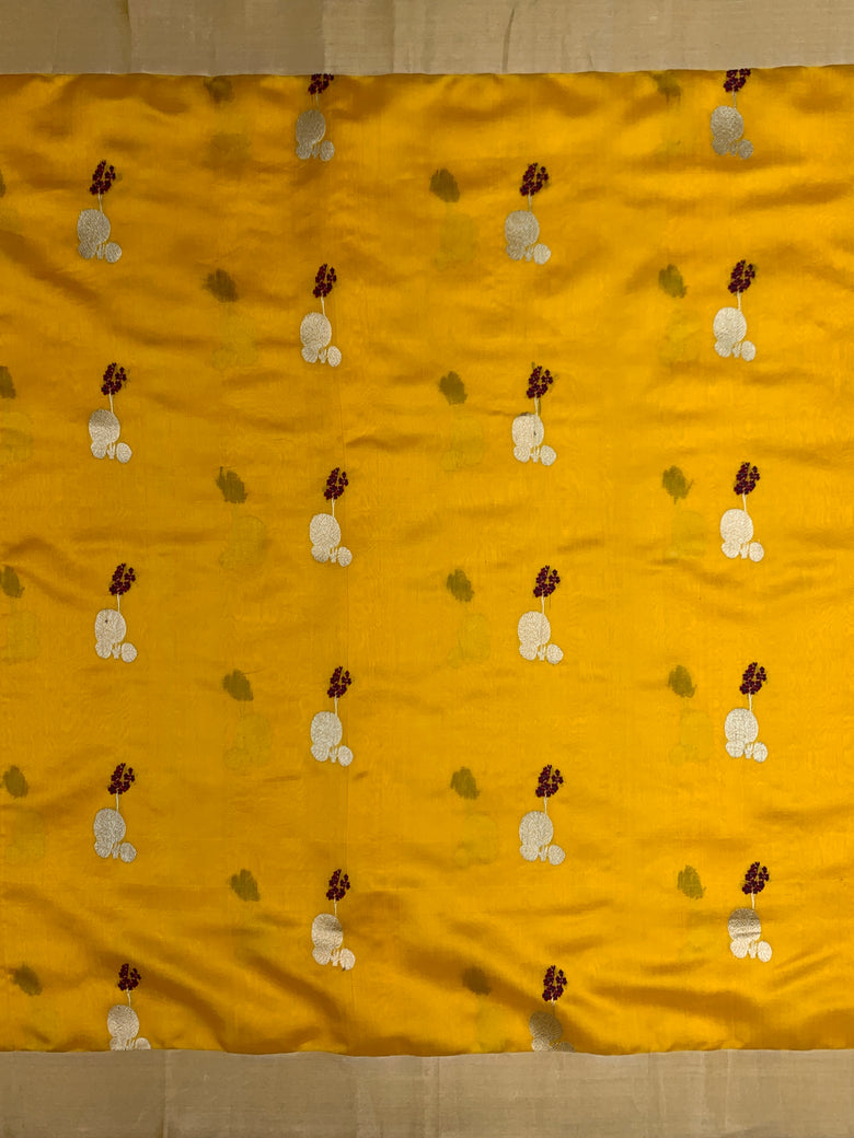 Mango-yellow chanderi silk saree is adorned with silver zari and threadwork floral buttis all over, featuring a self kaddi border and brocade pallu. the blouse is plain with a matching border.