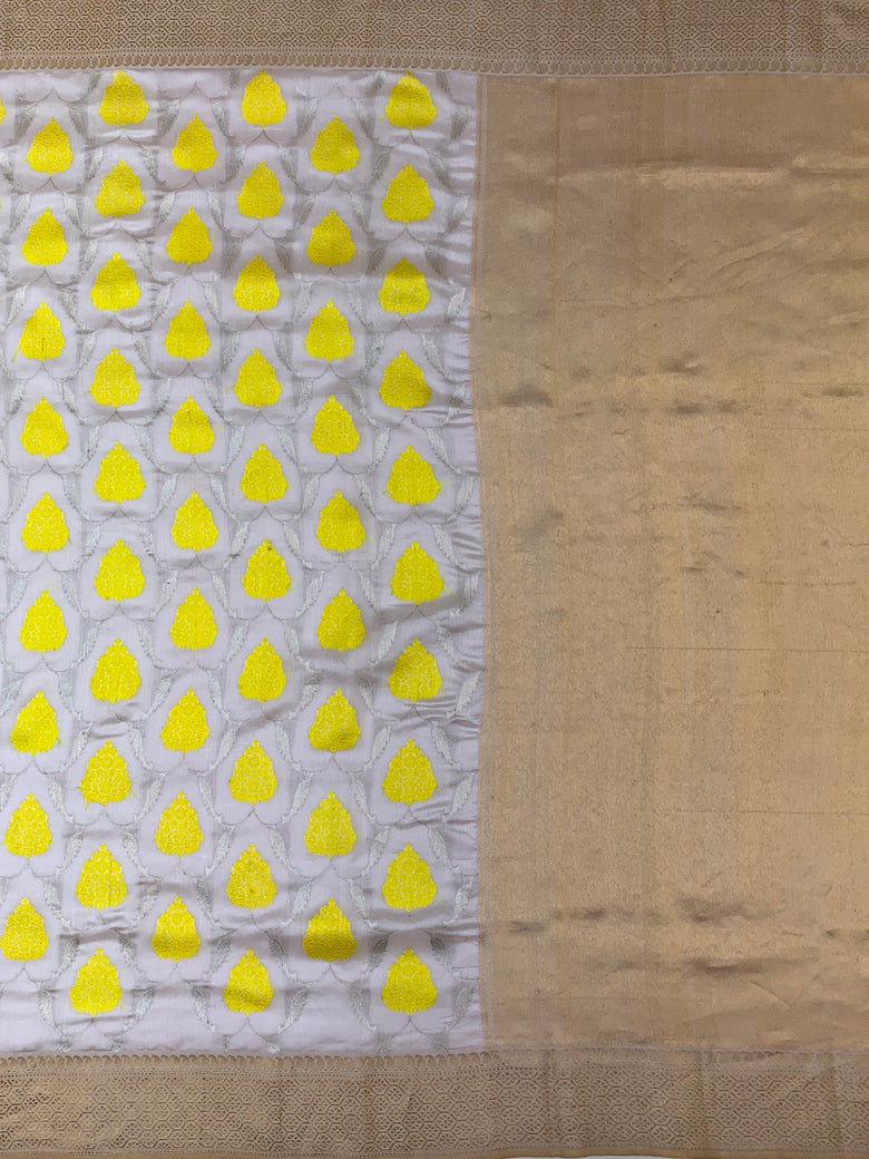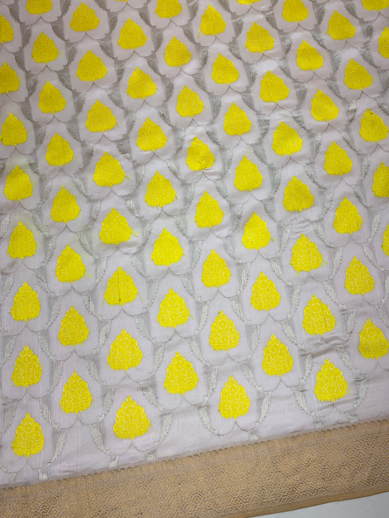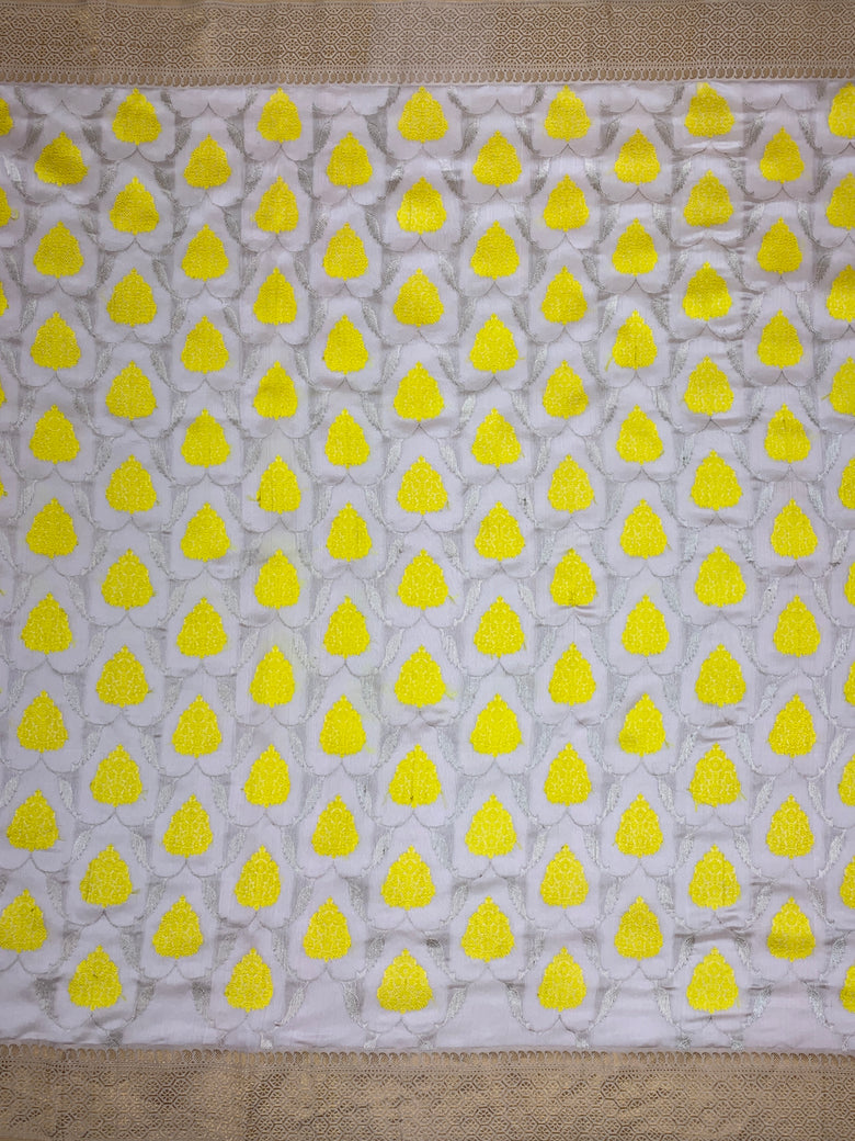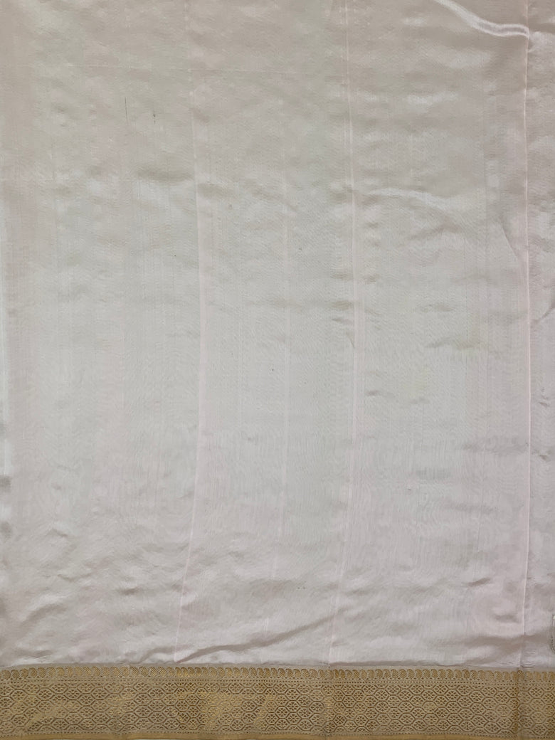 Chanderi silk saree features an intricate all-over silver zari and thread floral jaal design, complemented by a contrasting traditional floral border and a brocade pallu. Presented in a pastel-pink shade, it includes a matching plain blouse with a border, perfect for a graceful and elegant look.