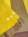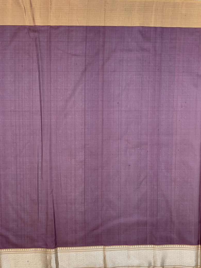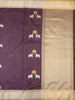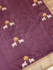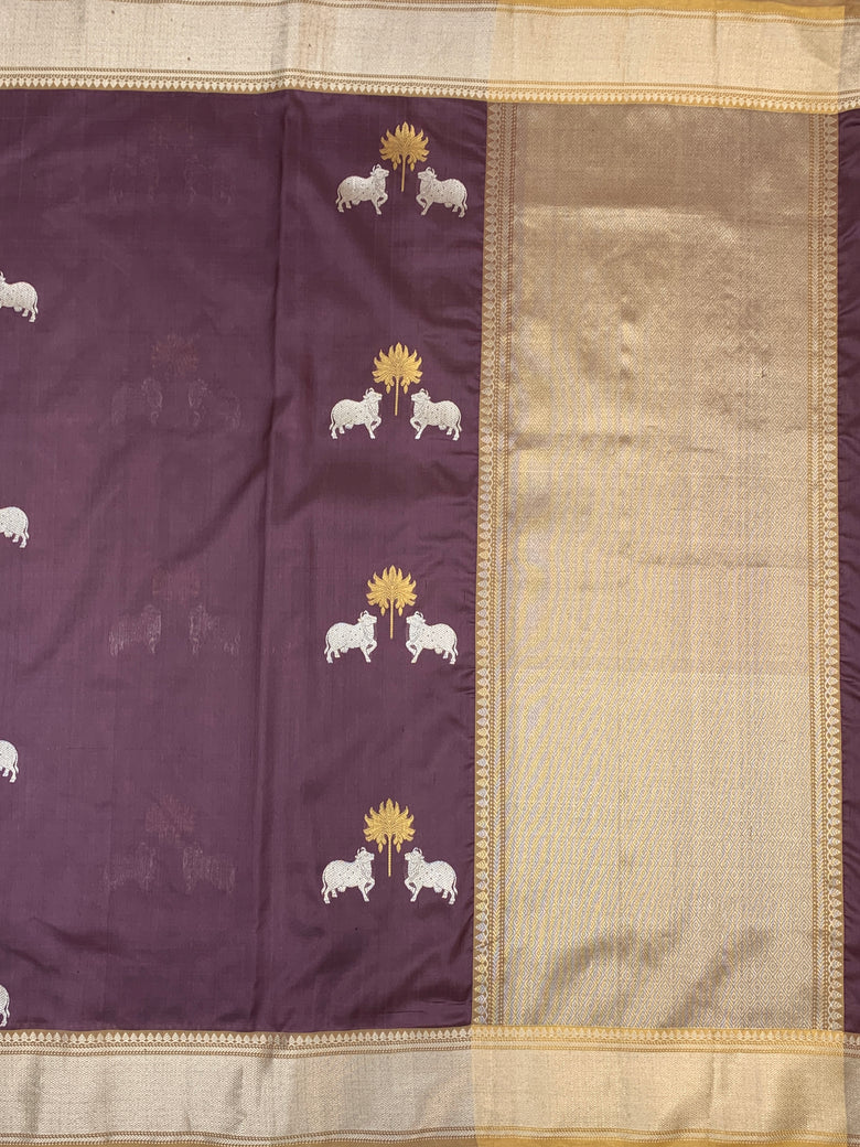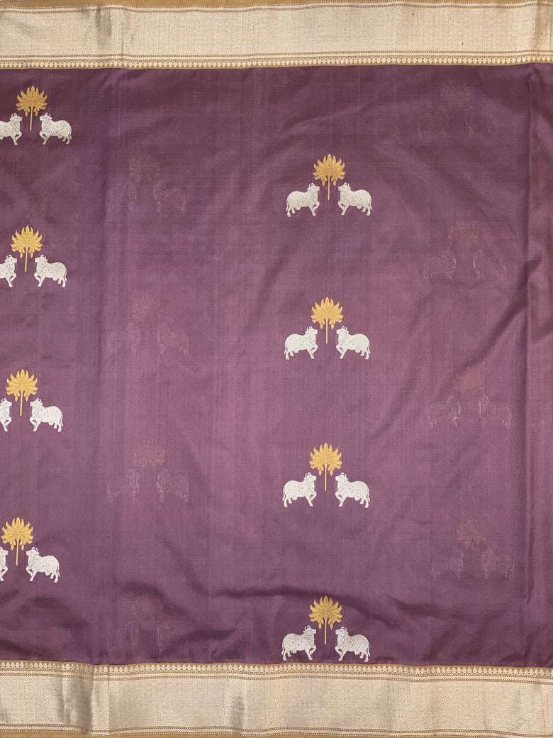 This beautiful chanderi silk saree is crafted with gold and silver zari floral designs and cow motif buttis throughout. It features a matching self brocade border and pallu in a wine color. The blouse is plain with a coordinating border.