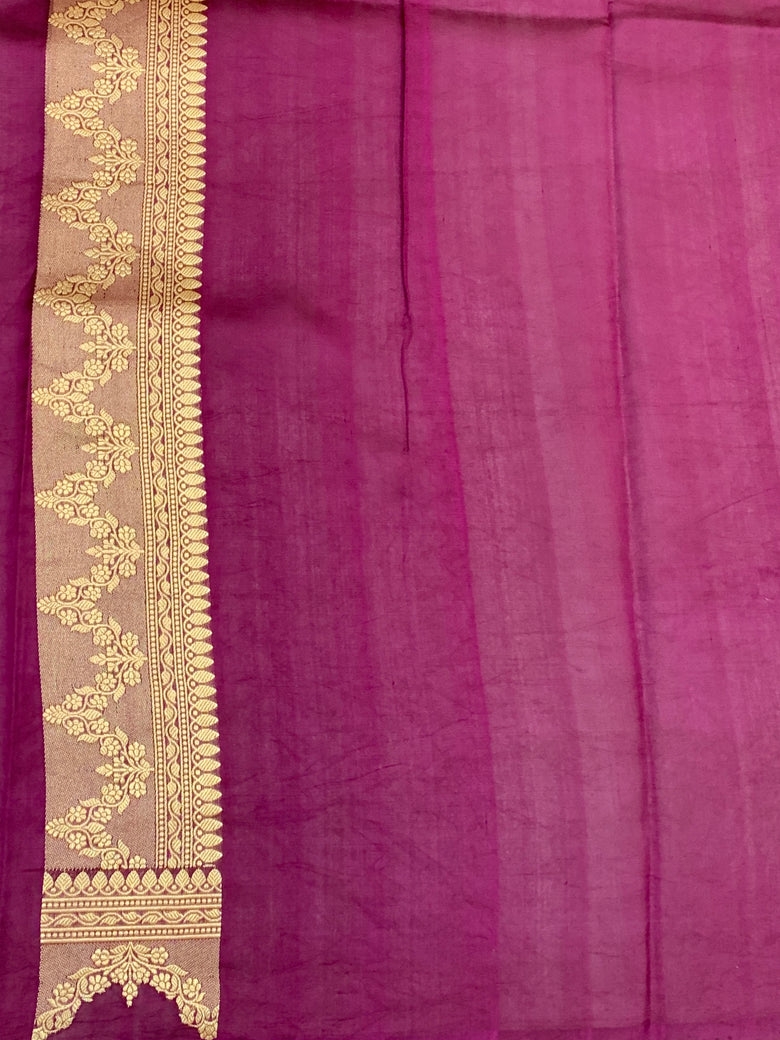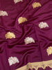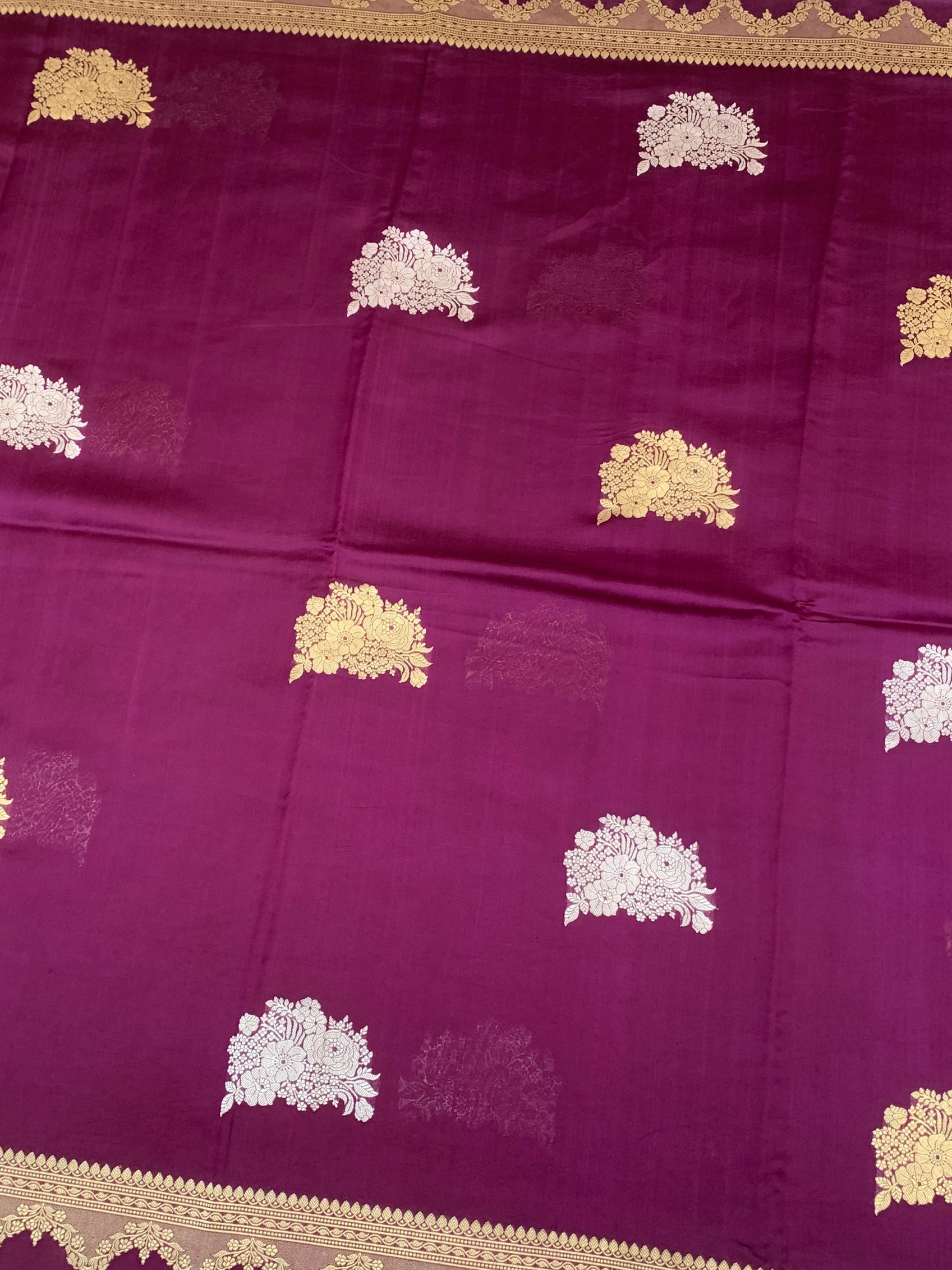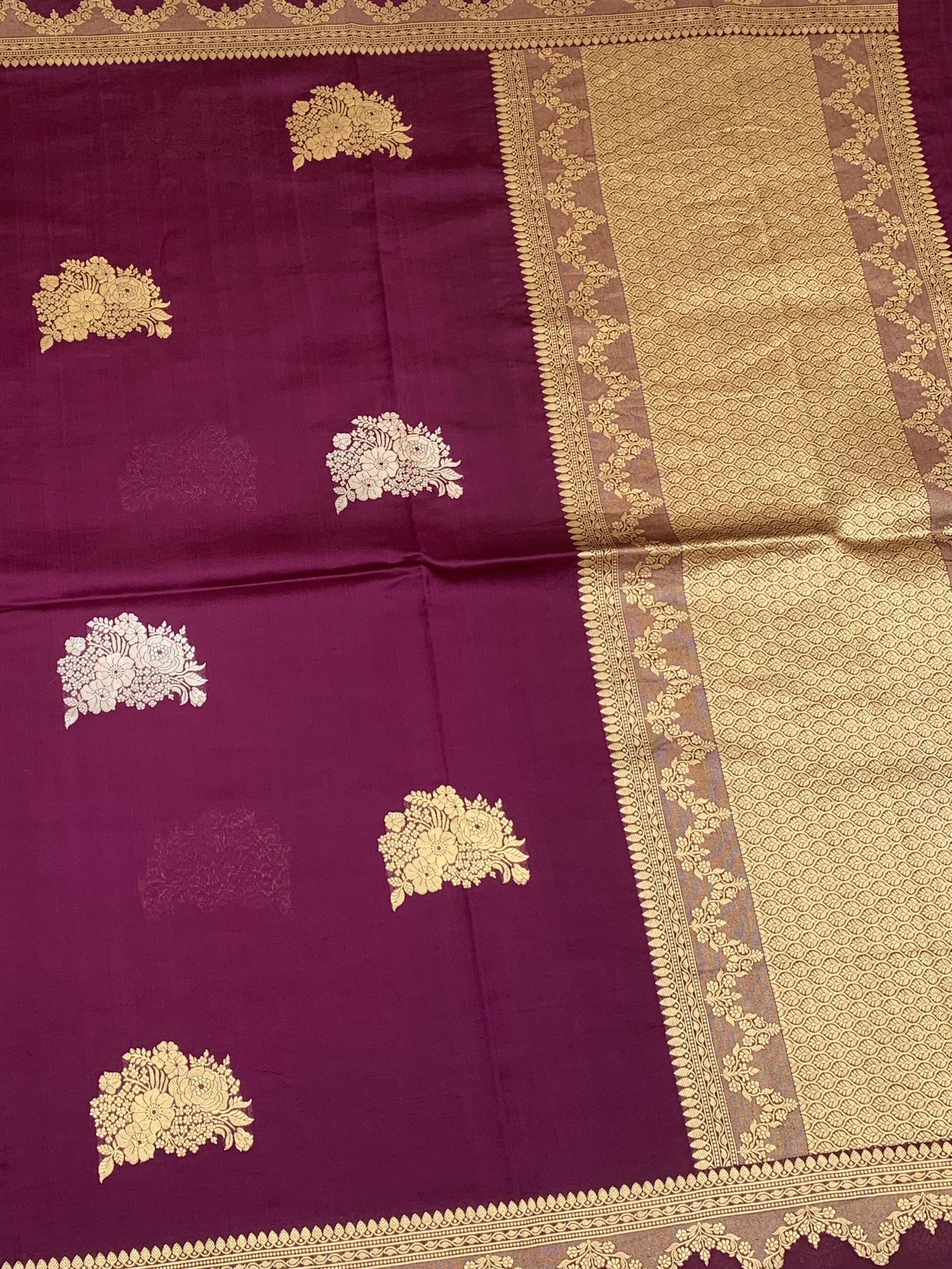 Chanderi silk saree in a rich wine hue features an intricate all-over weave of gold and silver zari floral buttis. It is complemented by a self-design floral border and an ornate brocade pallu, paired with a plain blouse accented by a coordinating border.