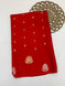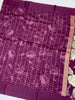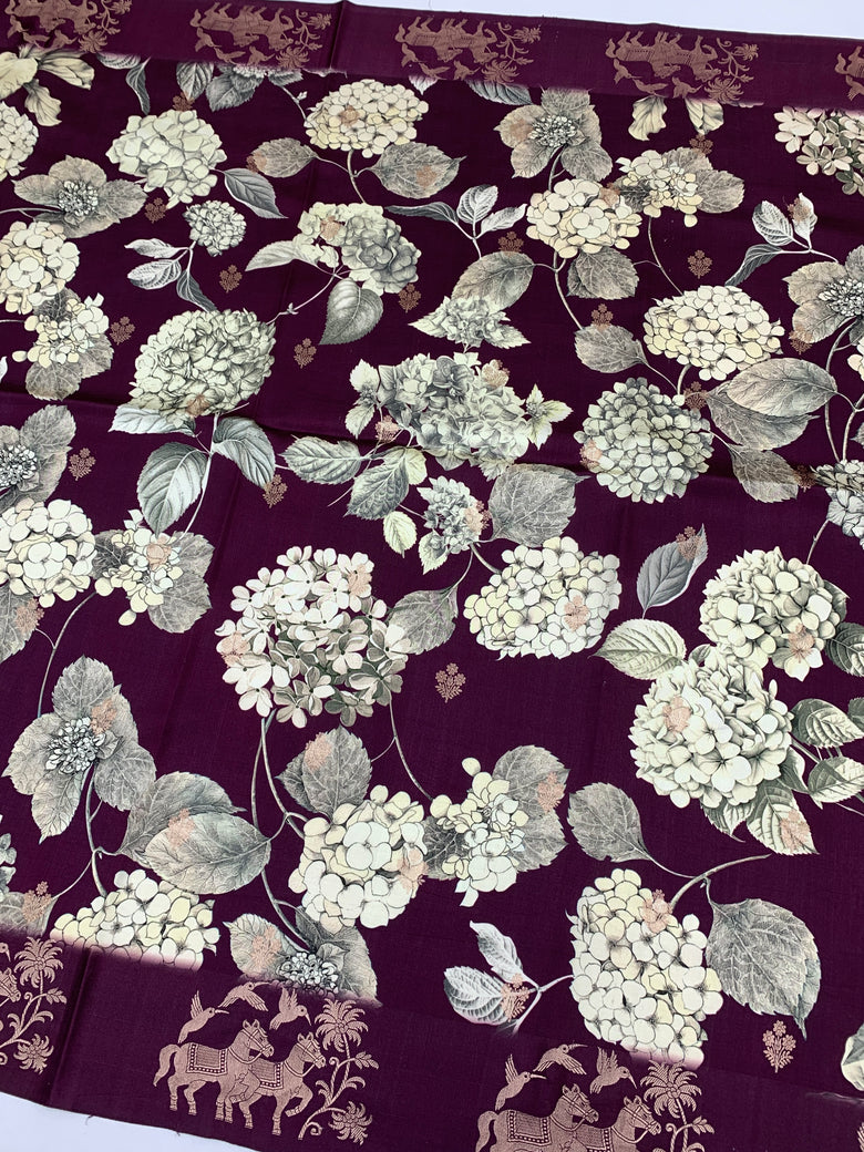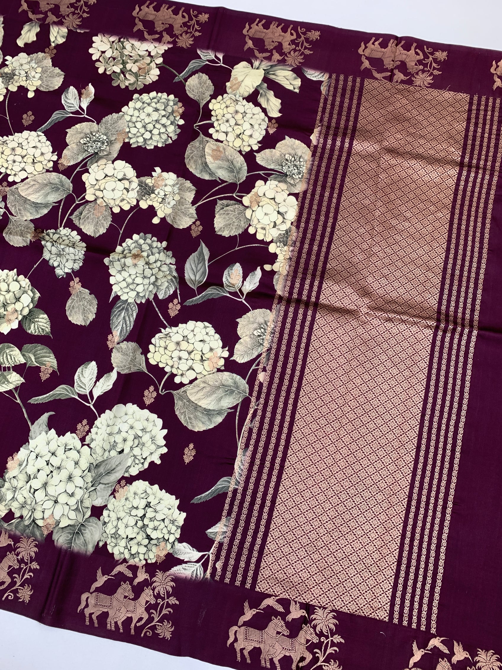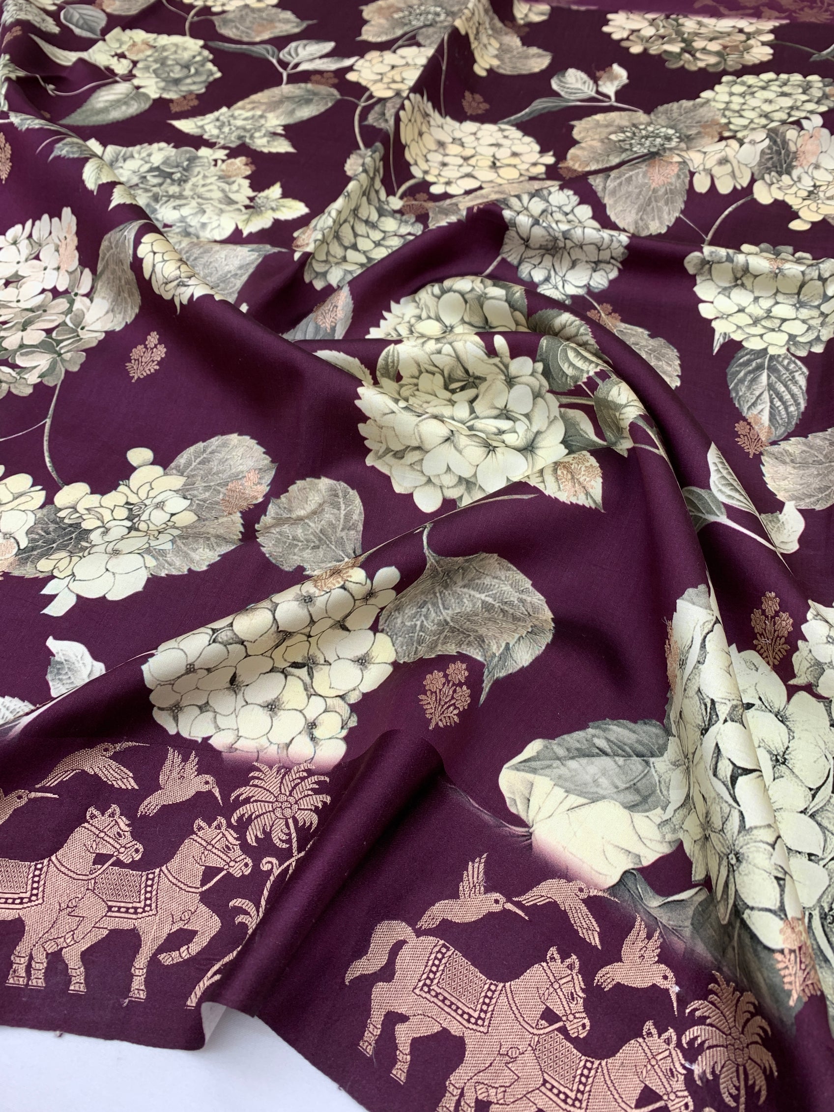This wine chanderi silk saree features an all-over floral print embellished with gold zari floral buttis. It is highlighted by a self border adorned with gold zari horse and birds motif buttis and a brocade pallu. The blouse is self floral printed with zari patterns and finished with a coordinating border.