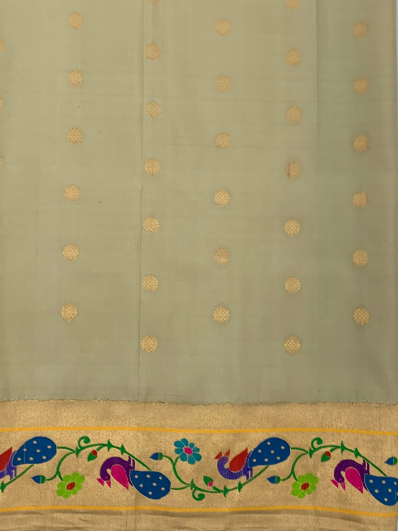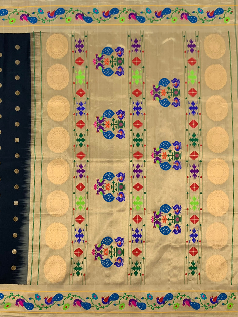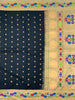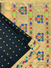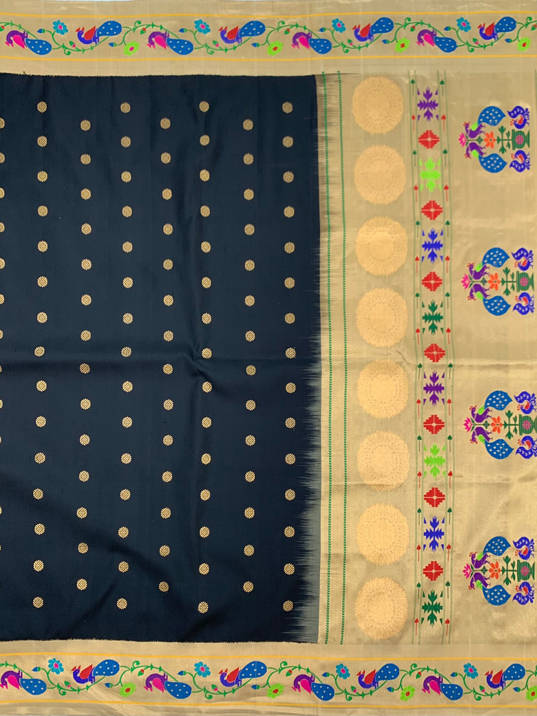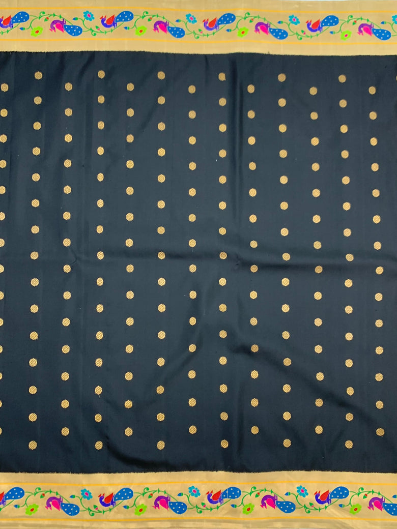 This Gadwal Pattu Saree features a black color with an all over gold zari floral butta weave, complemented by a contrast paithani meenakari floral and peacock motif border and pallu. The blouse also boasts a contrast gold zari floral butta design with zari border.