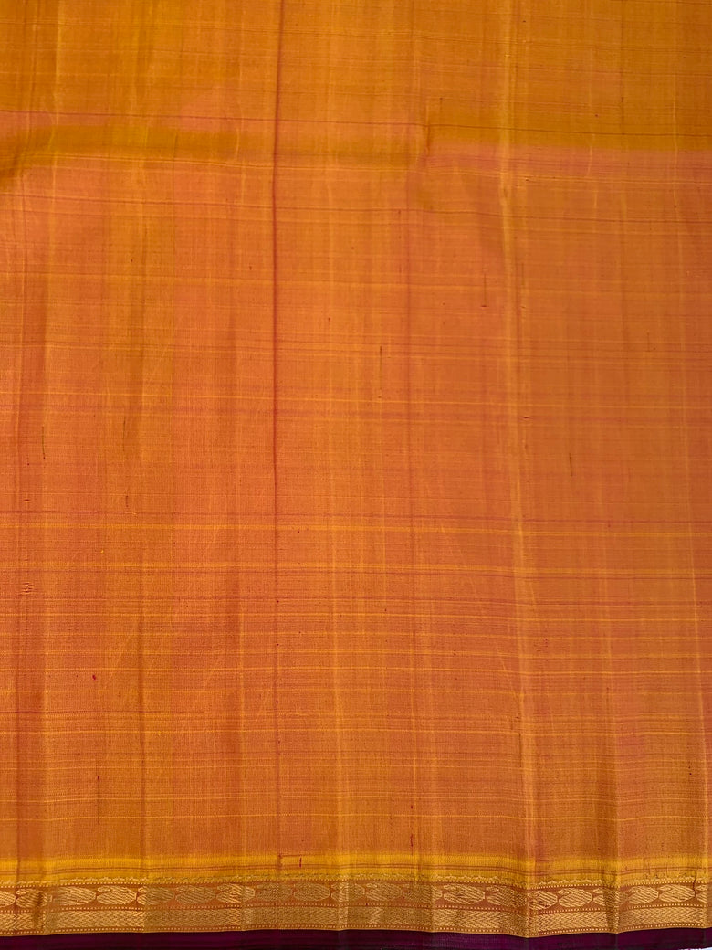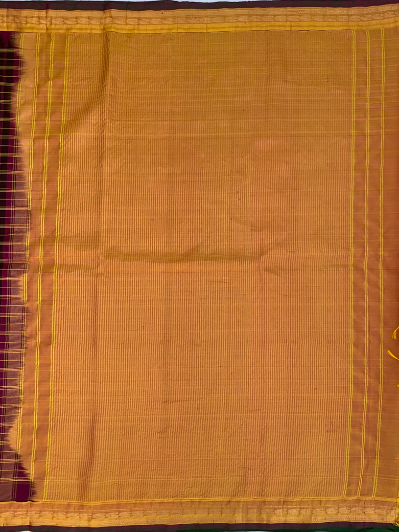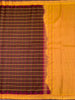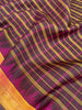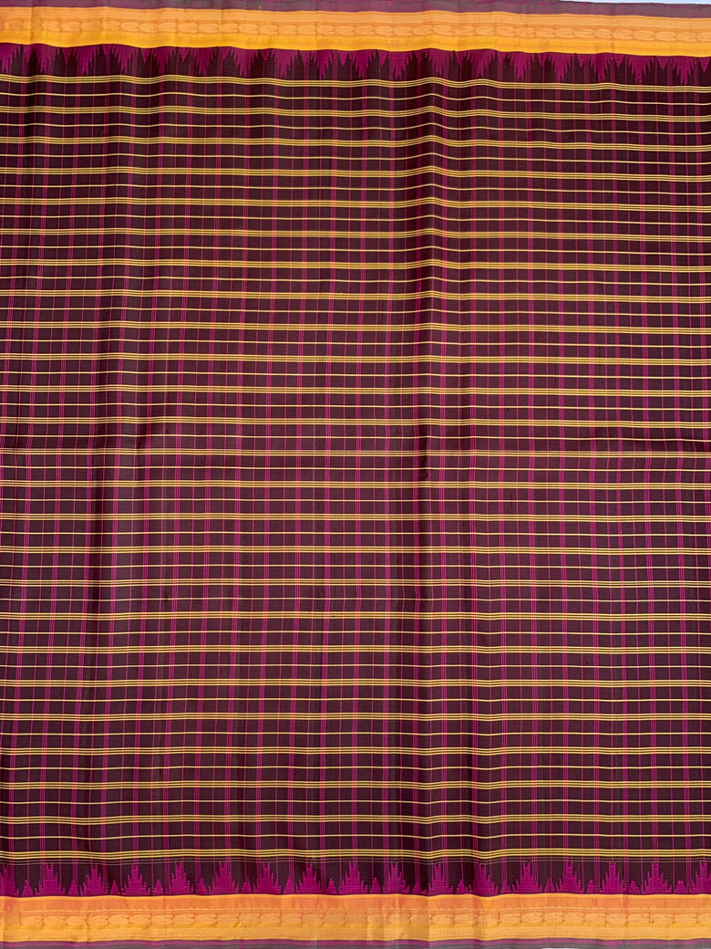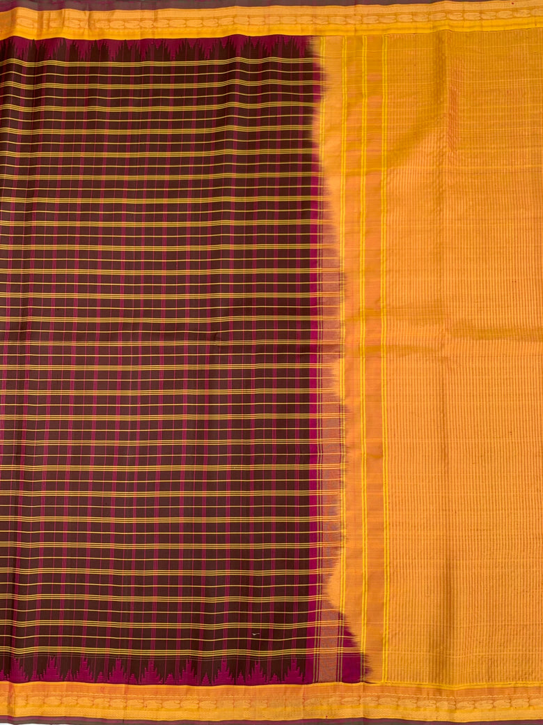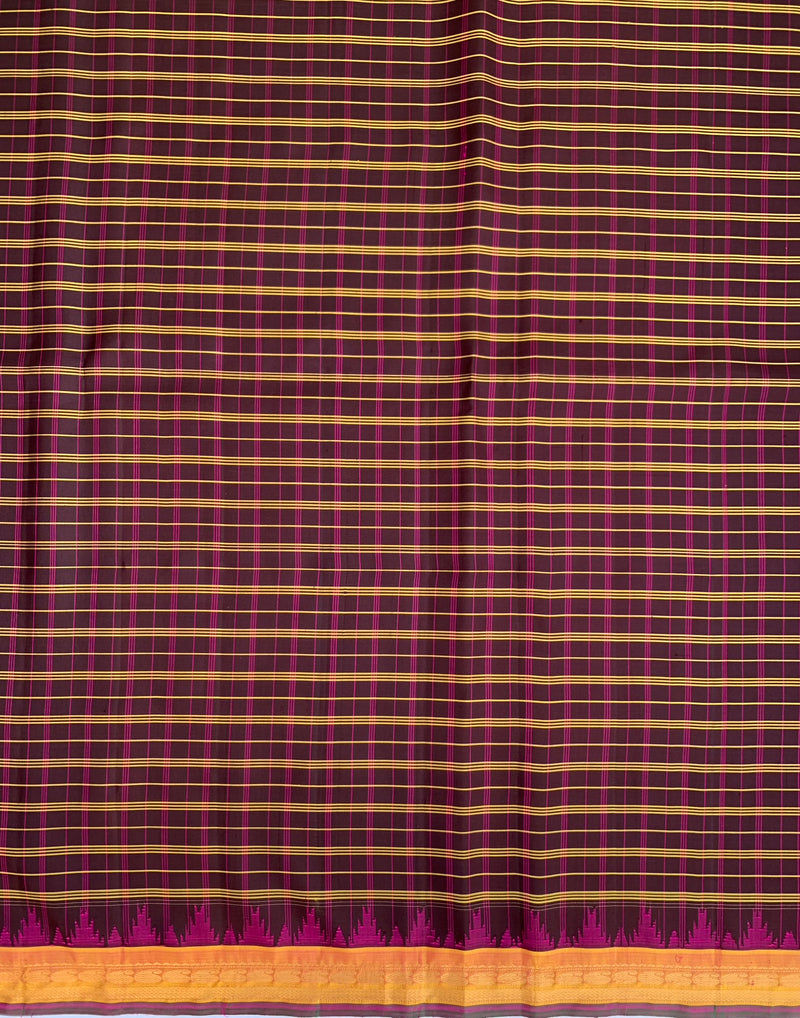 Fabricated from Gadwal Pattu Silk, sporting a Zari-Bordered Checks weave, with a Dark Brown hue, and paired with a Contrasting Zari Border blouse.