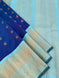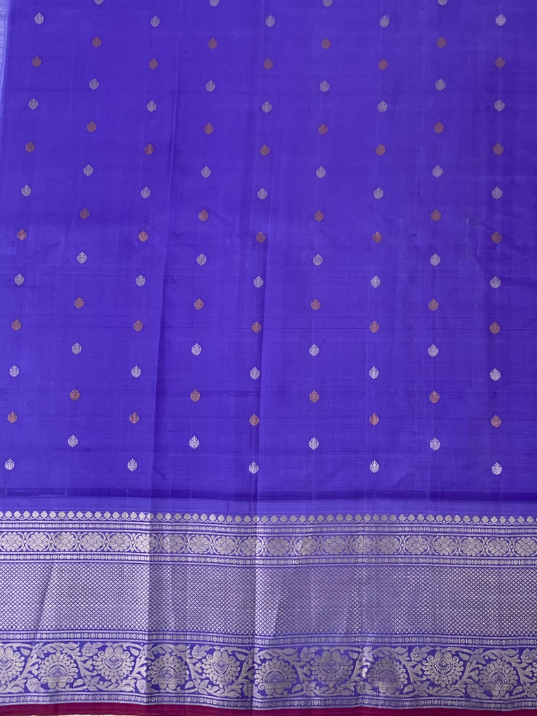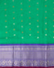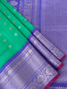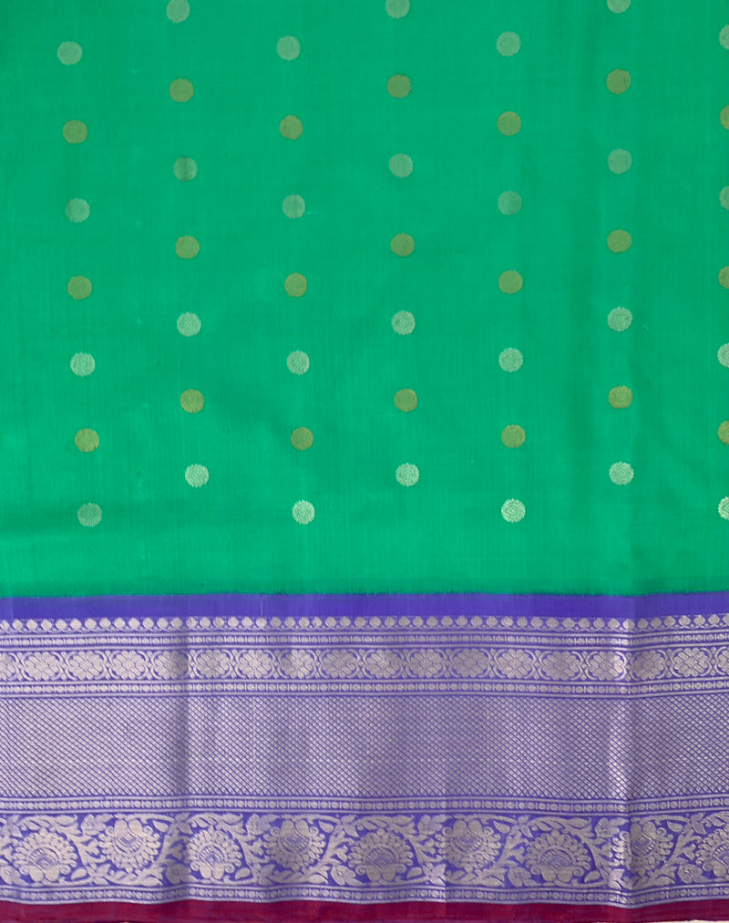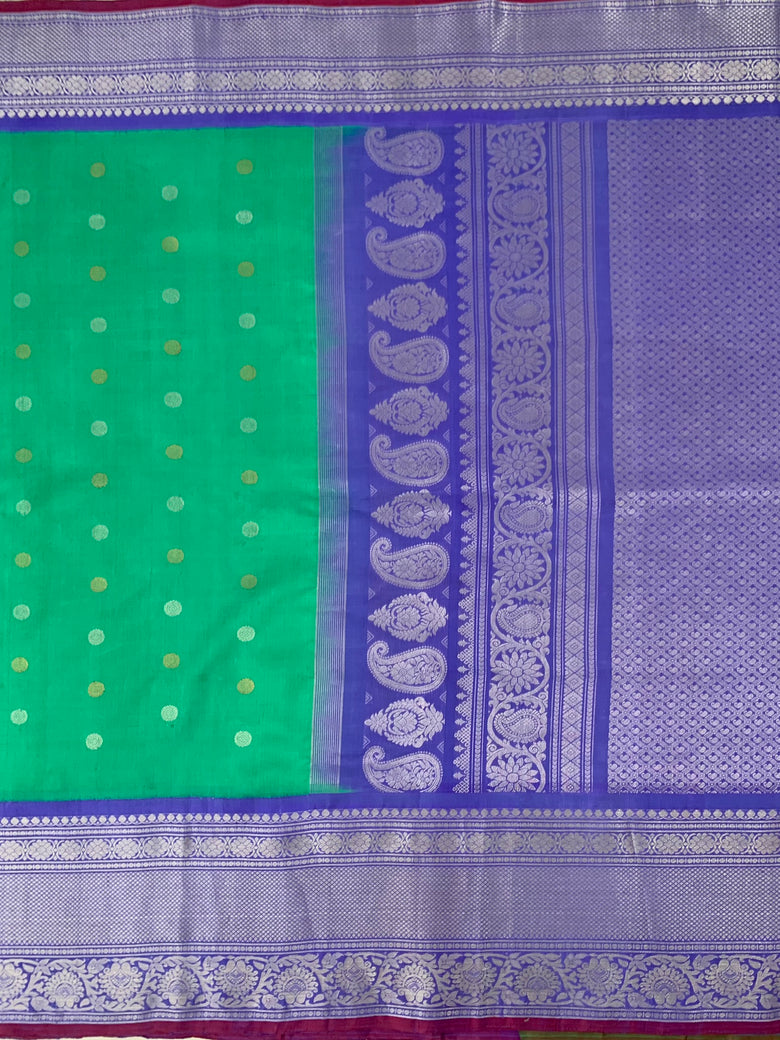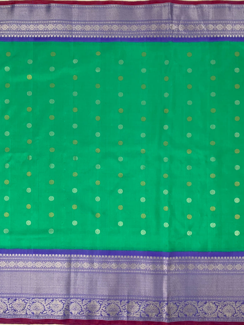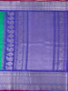 This premium Gadwal Pattu saree is crafted from pure silk and features an array of intricate silver and gold zari buttas, accompanied by a contrast border and pallu. The primary hue of this saree is a vibrant green, and the look is completed with a contrast buti blouse with zari border.