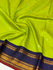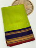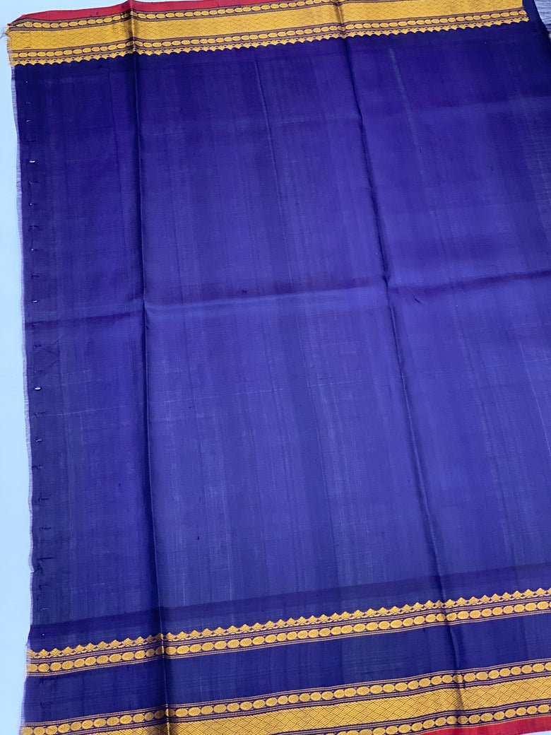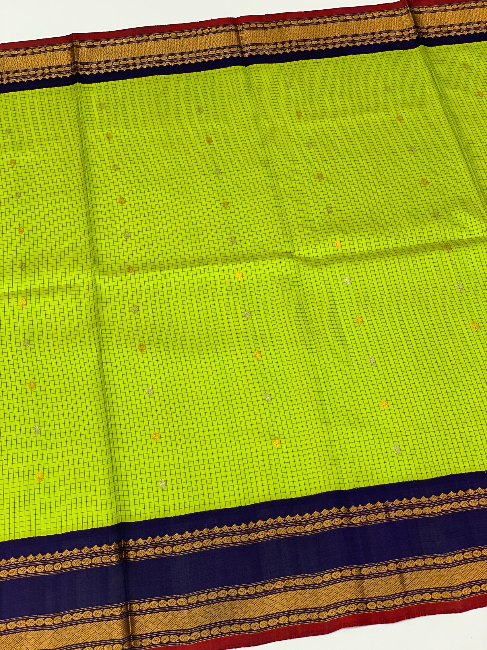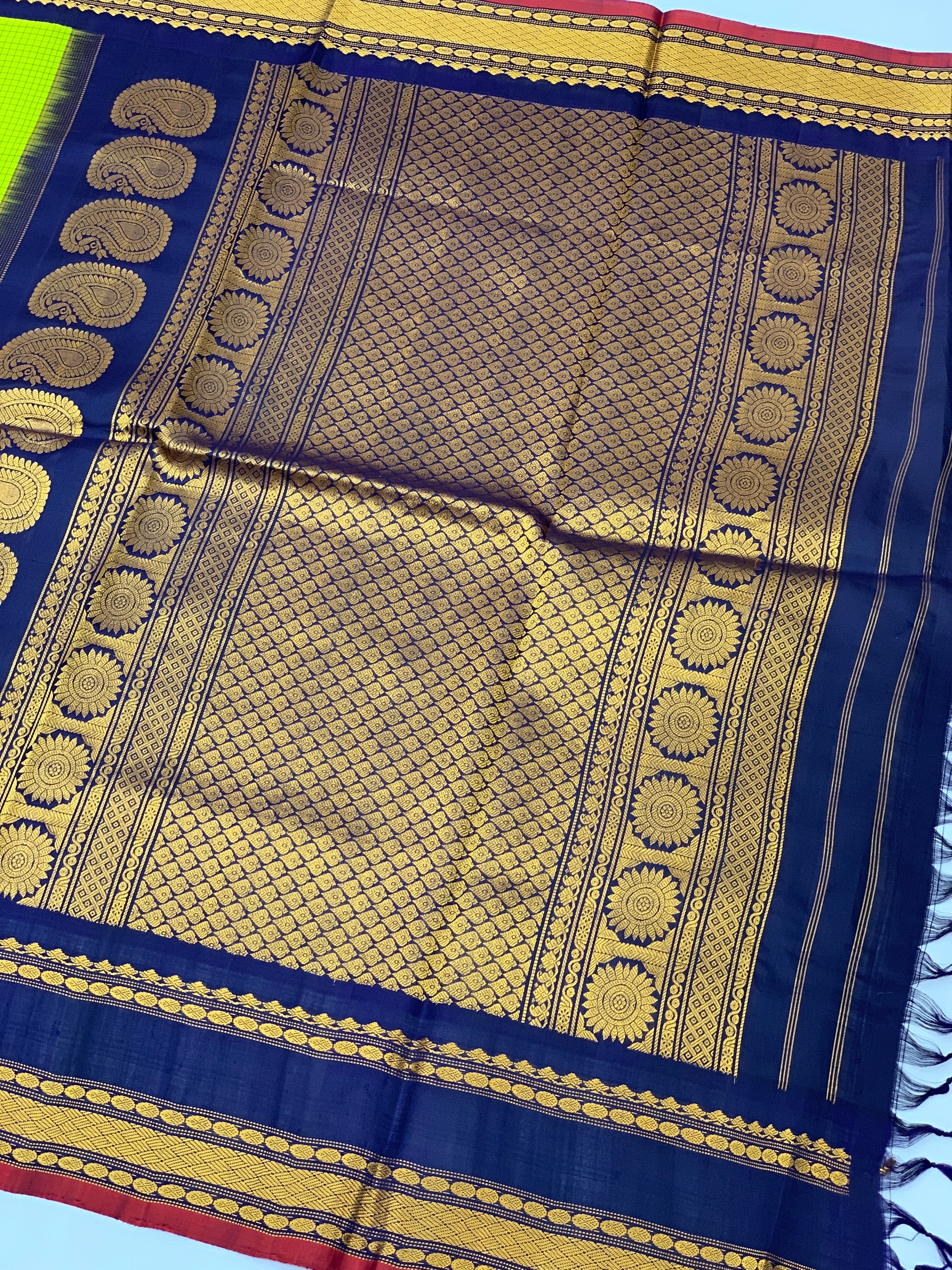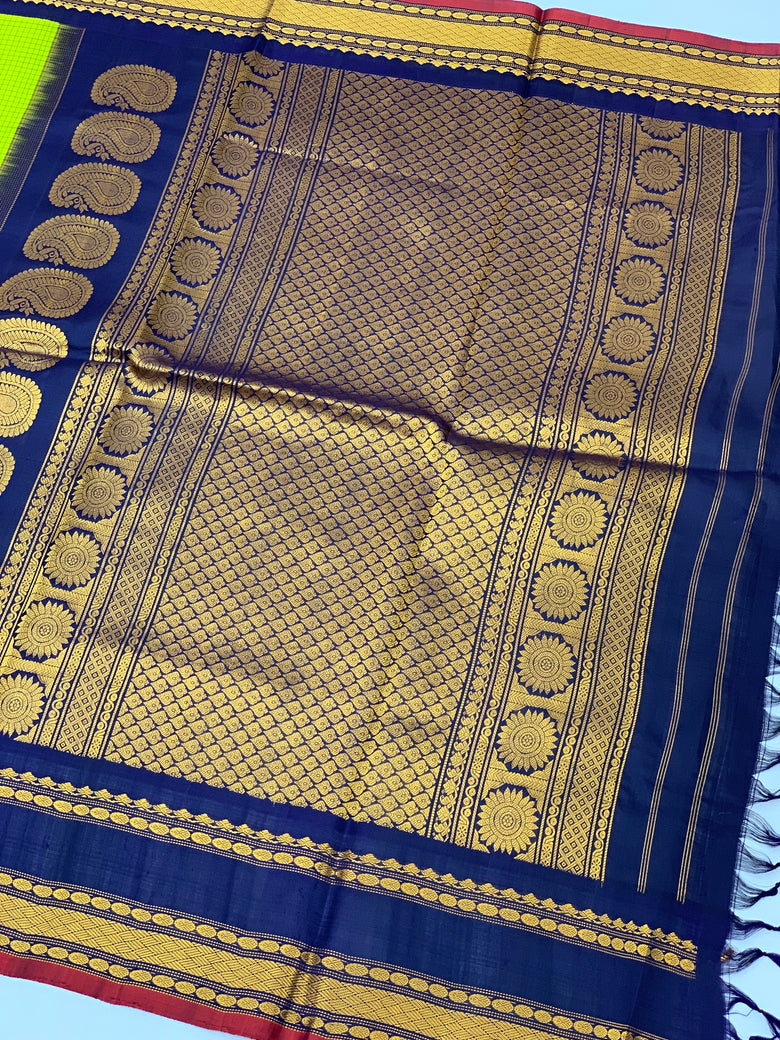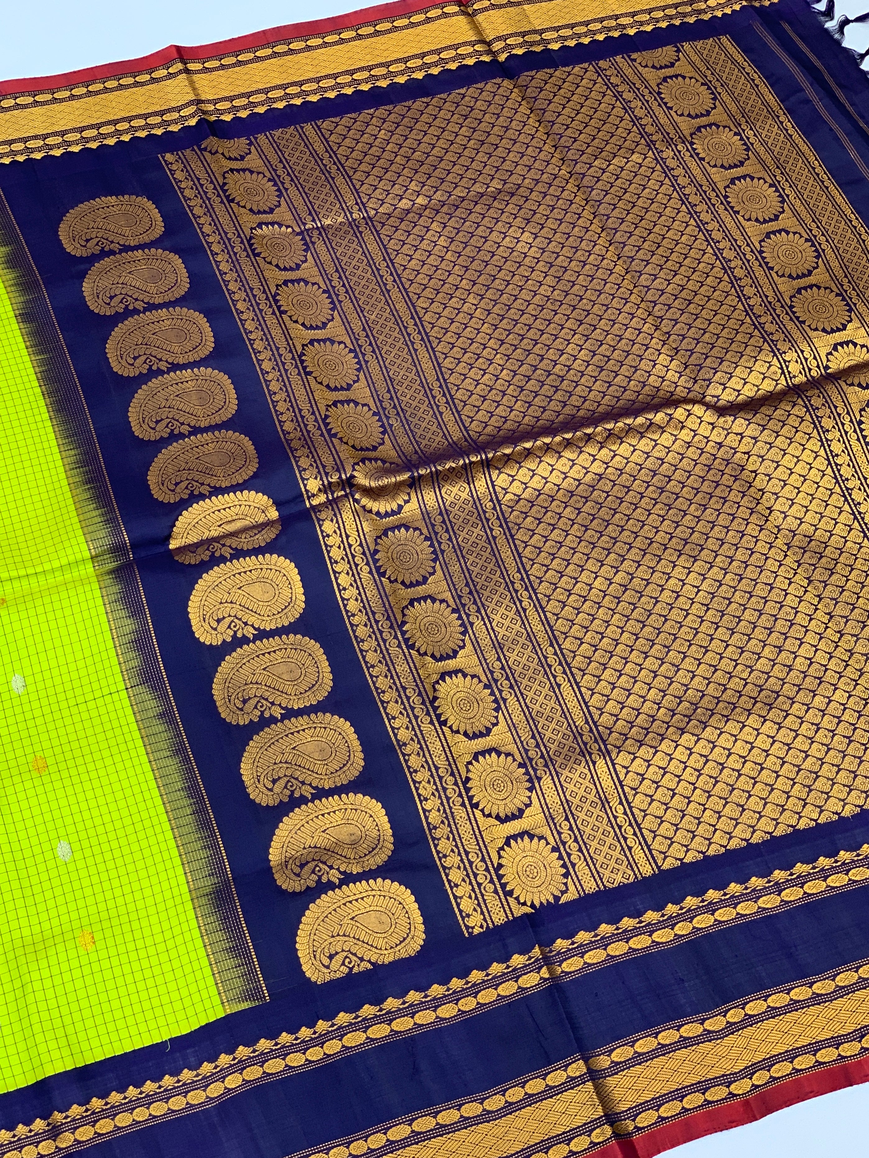 This Gadwal pattu saree displays a detailed pattern of gold and silver zari motifs woven throughout, complemented by a checkered design across the fabric. It is accentuated with a contrasting traditional border and an elegant brocade pallu in a striking green hue. The accompanying blouse is kept simple, featuring a zari-edged border to enhance the overall contrast.