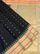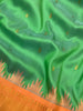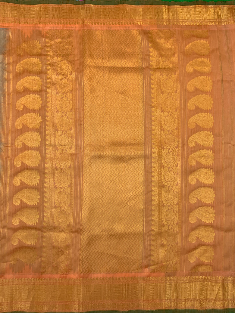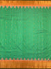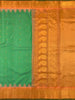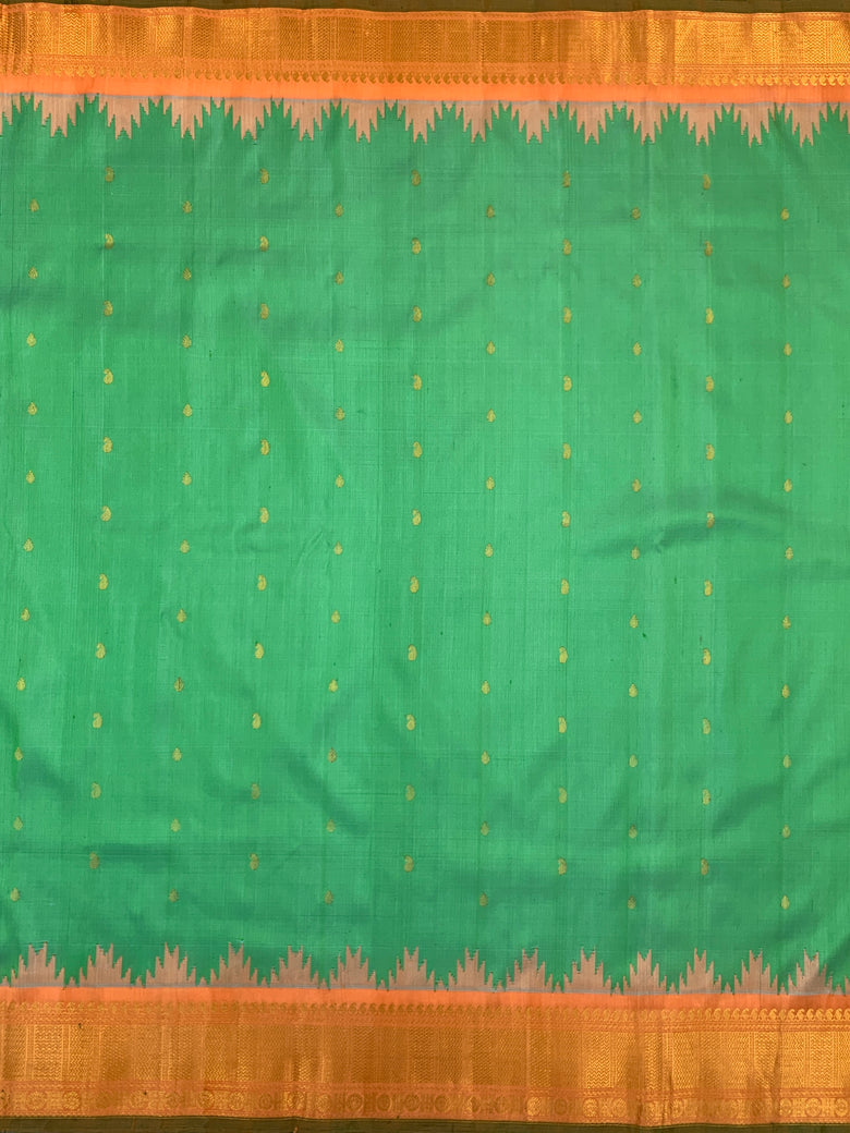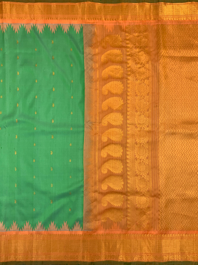 This Gadwal pattu saree features an intricate weave of gold zari floral buttis all over the fabric. It also includes a contrast brocade border and pallu, showcasing a beautiful pista-green color. The blouse is plain with a zari border for added contrast.