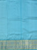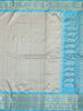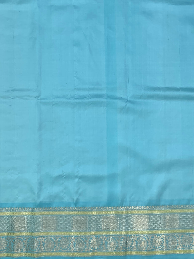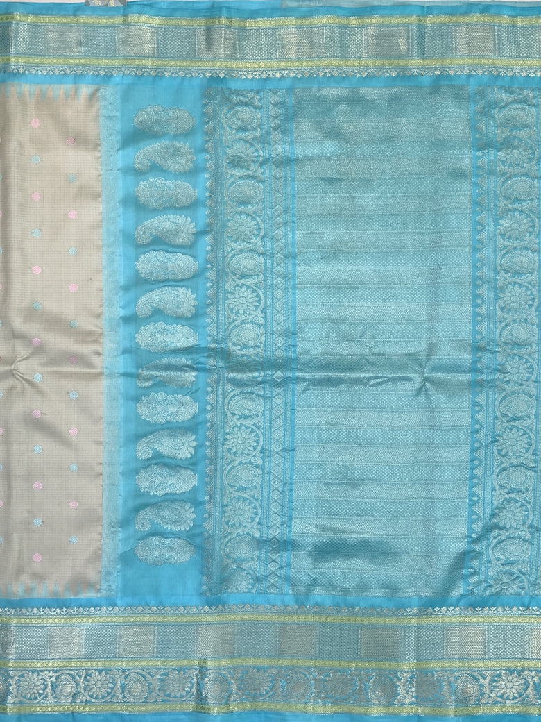 This half-white Gadwal saree features intricate thread weave checks and meenakari floral buttis throughout its body, along with a contrasting brocade border and pallu. The plain contrast blouse is adorned with a zari border.