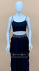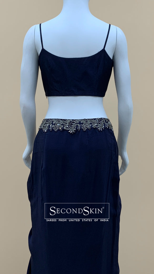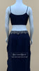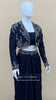 This navy-blue co-ord set is a combination of luxurious silk and delicate crepe material, with a cropped blazer adorned with intricate embellishments such as cutdana, pearl, sequins, and cheed work. The set also includes a stylish bralette and a beautifully pleated dhoti skirt.