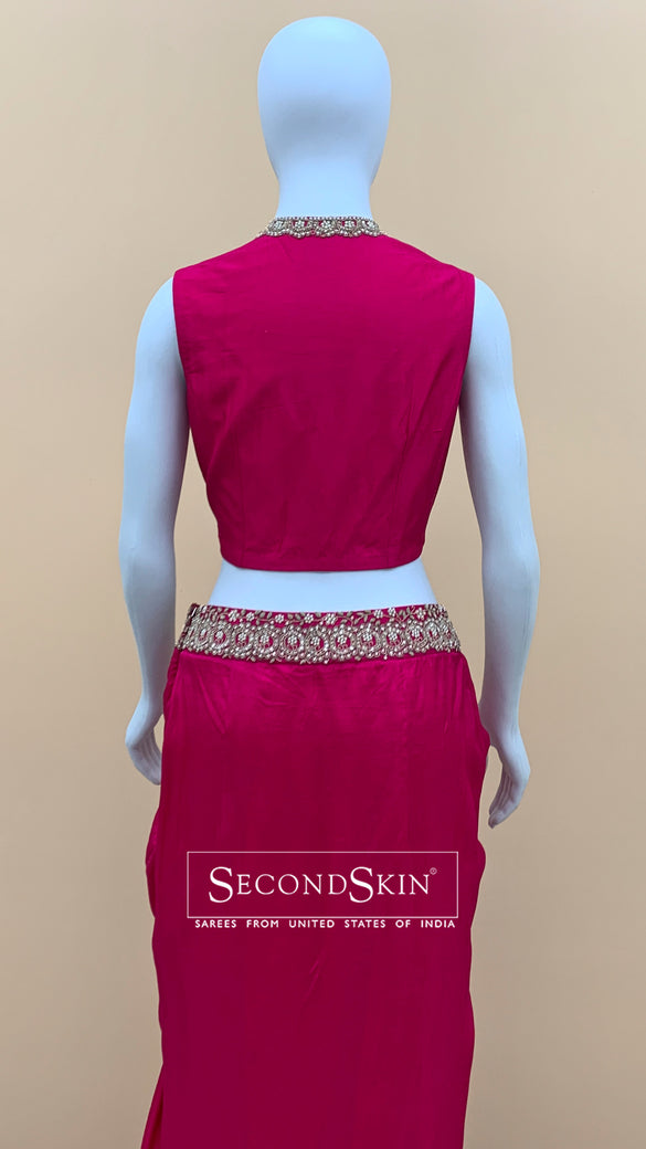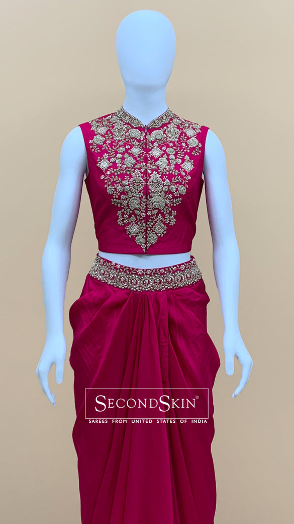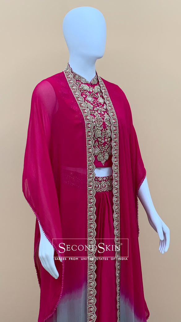 This elegant co-ord set features a sleeveless top with intricate embellishments, paired with a flowing skirt and a graceful ombre cape. The addition of zardosi work adds a touch of sophistication.