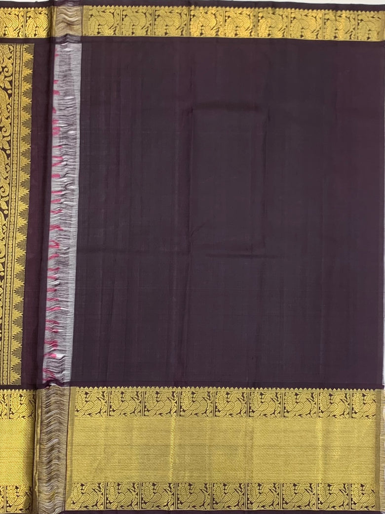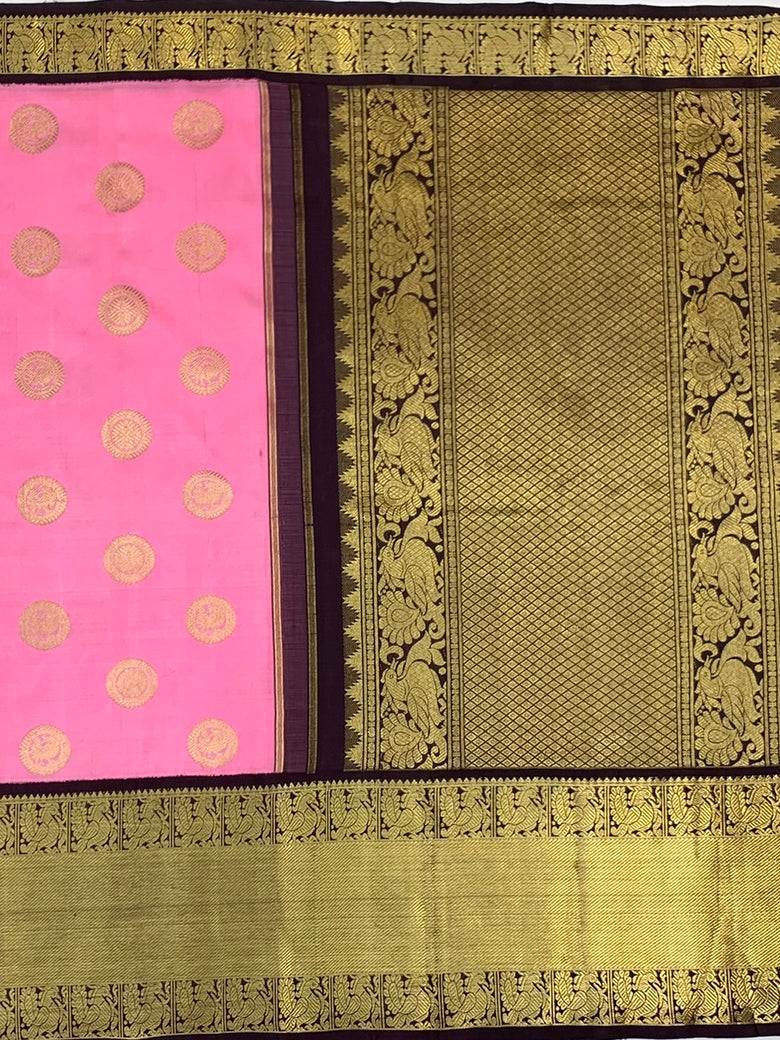 This Pink kanjeevaram silk Saree Will Help You Celebrate Your New Beginnings With Zeal And Fervour. The beautiful pink Base With gold zari buta allover .Brown contrast border give the high light to the saree.Paired with brown blouse