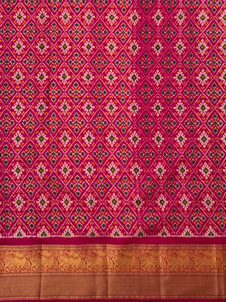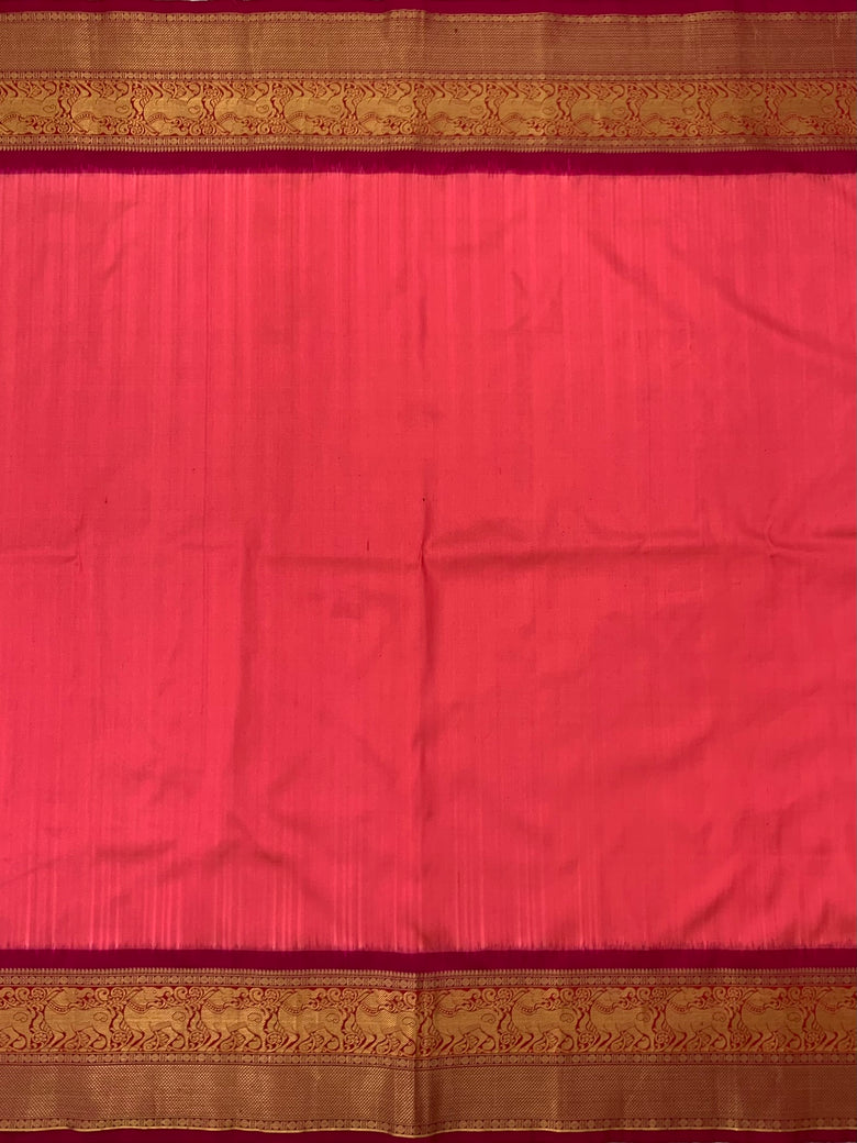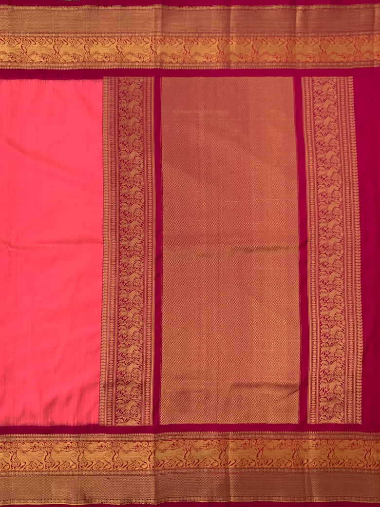 This Kanjeevaram ikat silk saree features an all-over plain weave with a contrast elephant gold zari motif border and brocade pallu. The beautiful peachish-pink color adds to its charm. The blouse showcases a contrasting ikat design with a zari border.